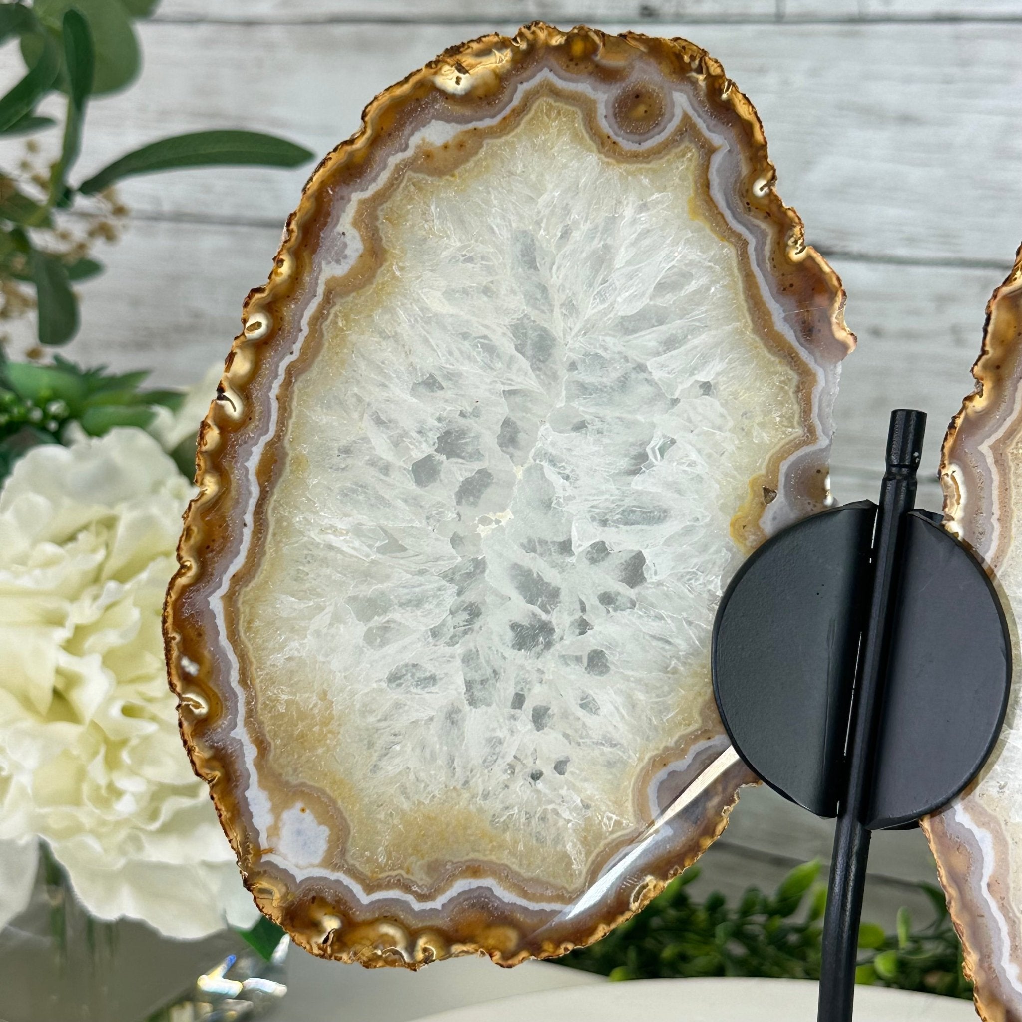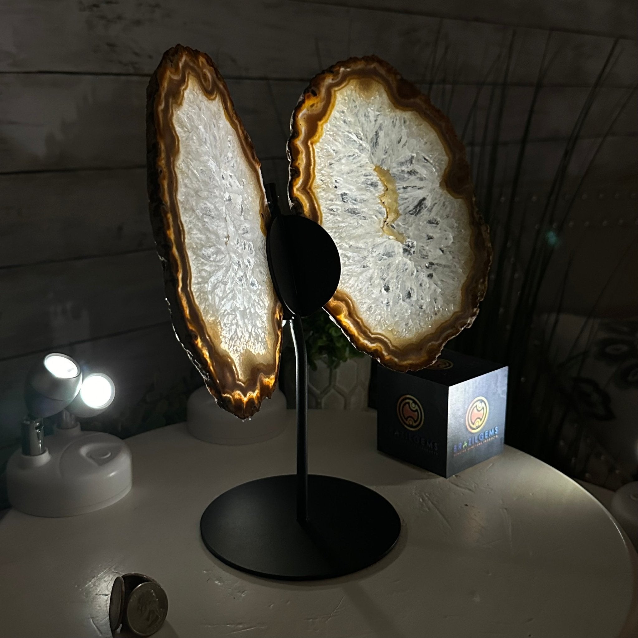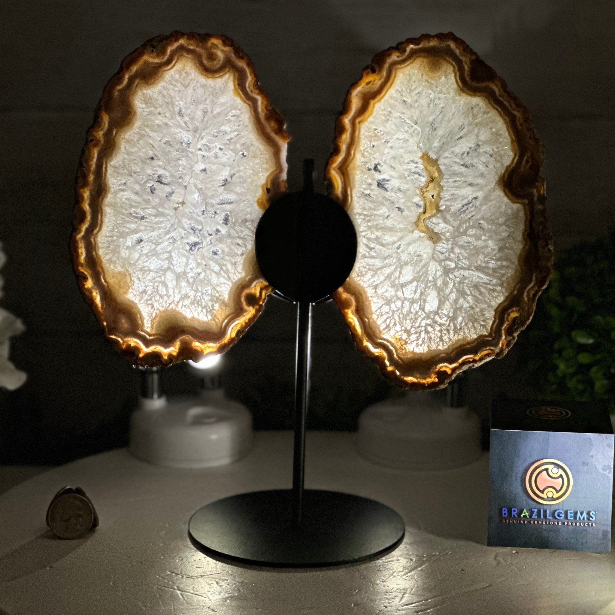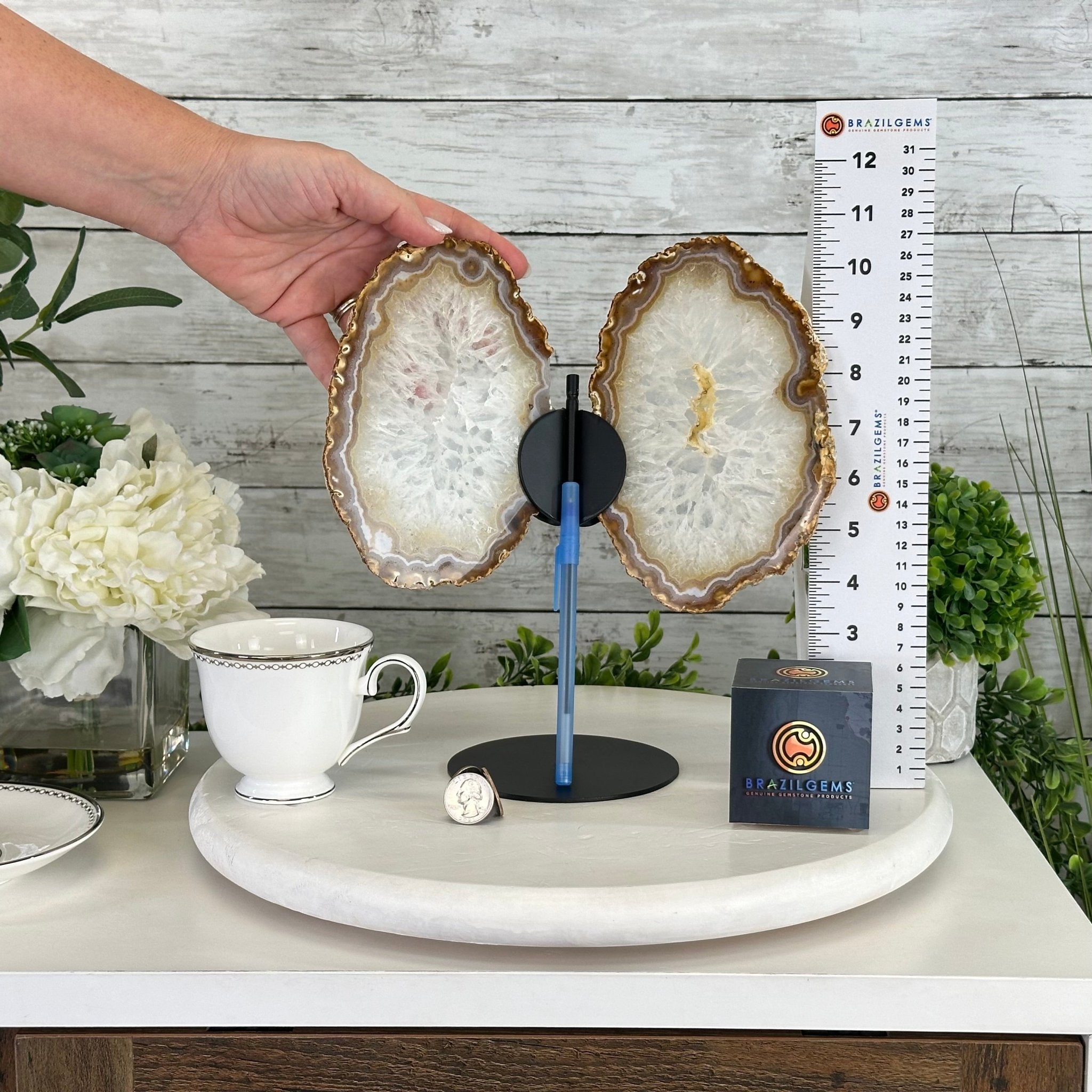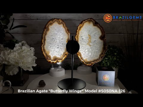 Brazil Gems® brings you this Natural Brazilian Agate Slices beautifully displayed as Butterfly Wings on a black metal stand. These are delicate and elegant pieces that will accent any décor and make for great gifts to a loved one. They are translucent and will look amazing with light behind or placed by a window.
