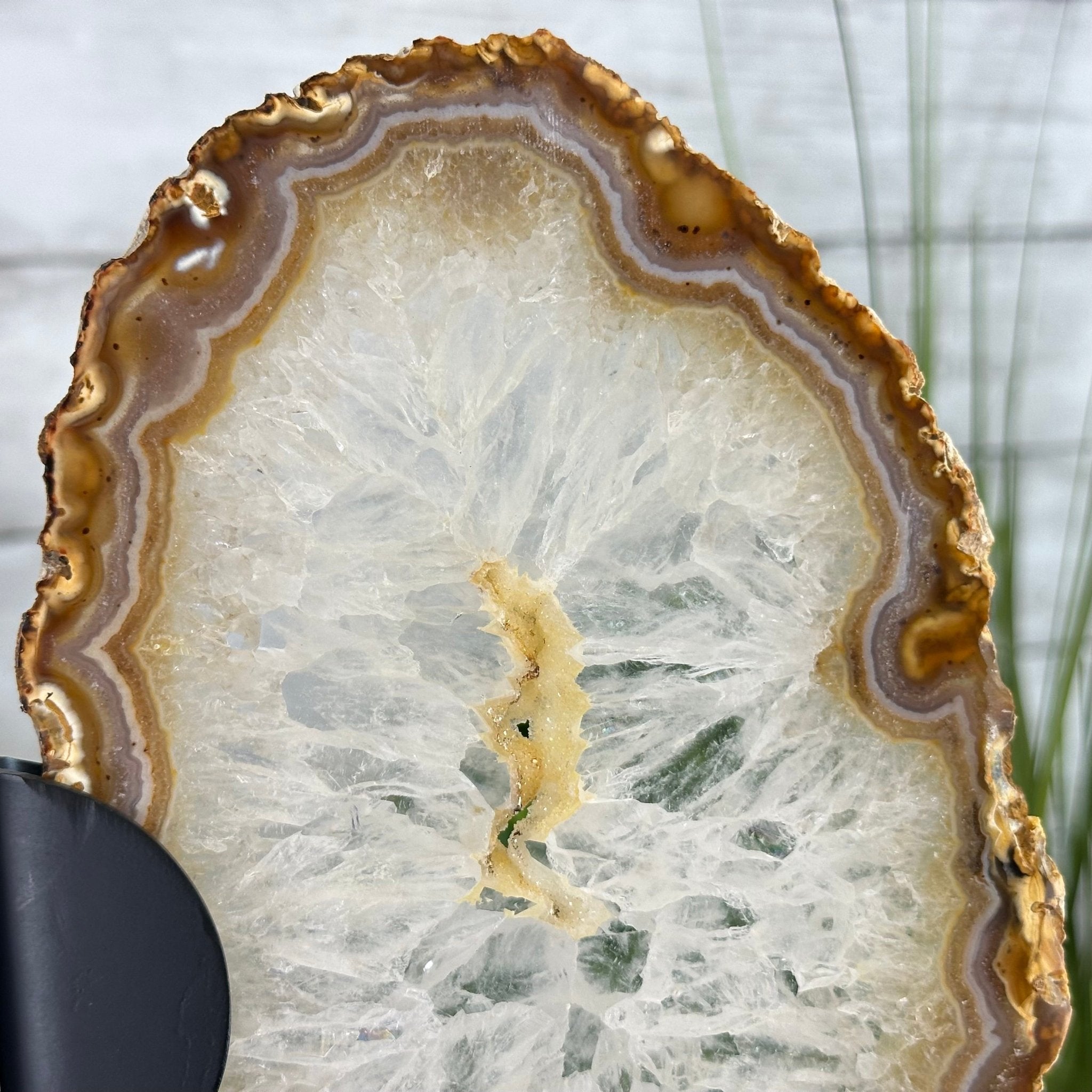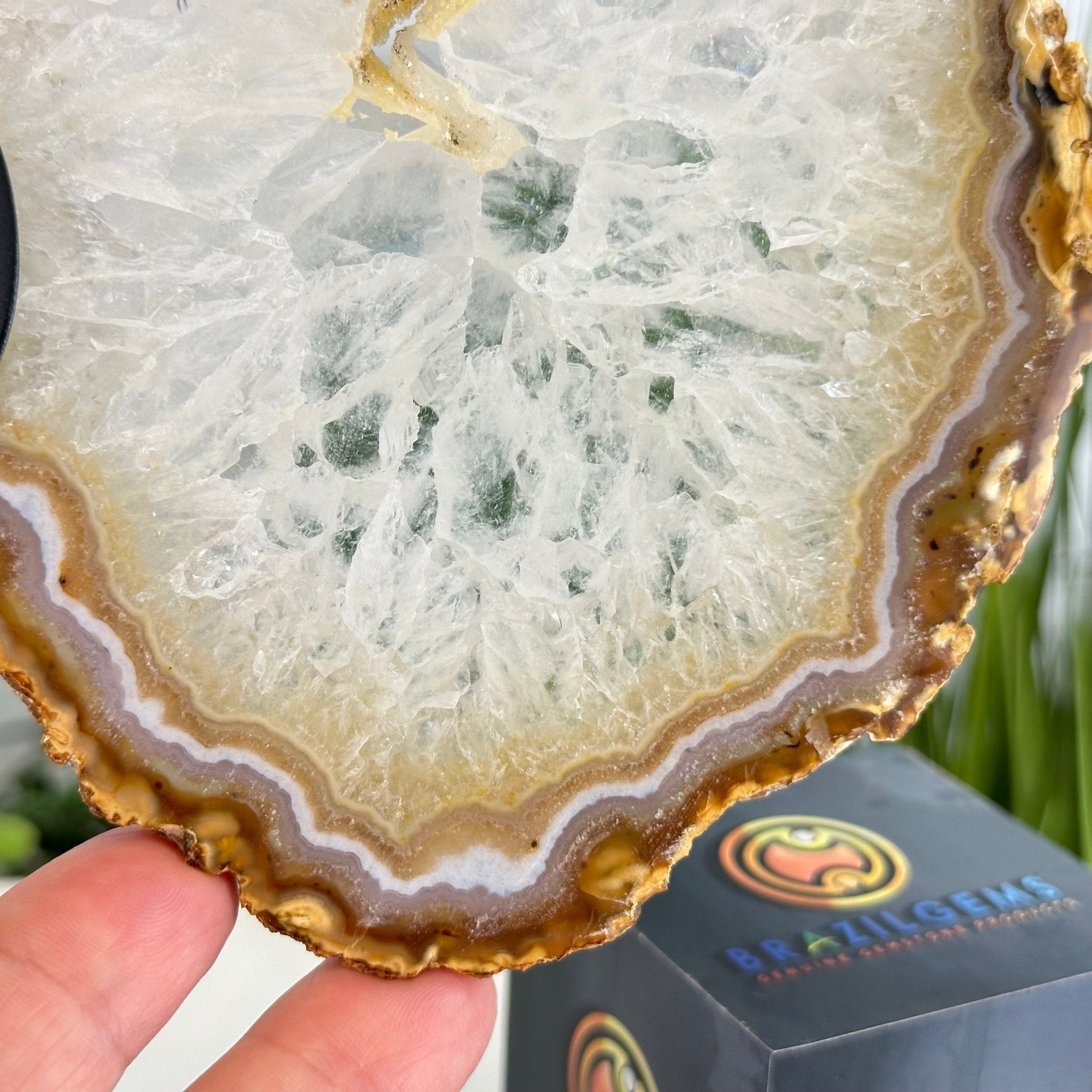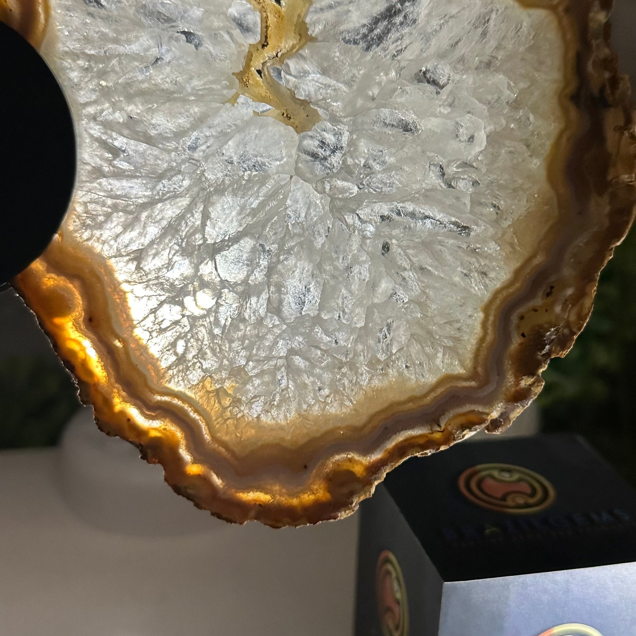 Brazil Gems® brings you this Natural Brazilian Agate Slices beautifully displayed as Butterfly Wings on a black metal stand. These are delicate and elegant pieces that will accent any décor and make for great gifts to a loved one. They are translucent and will look amazing with light behind or placed by a window.