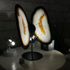 Disclaimer: This is a natural gemstone pair of slices sold by Brazil Gems® as is and as you see it in its images and video. It is the exact item you will receive. It may contain natural imperfections and/or imperfections, repairs, scratches and broken edges from the extraction, slicing, polishing and mounting processes. The metal stand has been painted black. Two screws are used per wing to gently secure each one in place in the stand; some assembly may be required. At Brazil Gems® we make every effort to get measurements as exact as possible but they are done by human hands and eyes and therefore may have minor discrepancies.