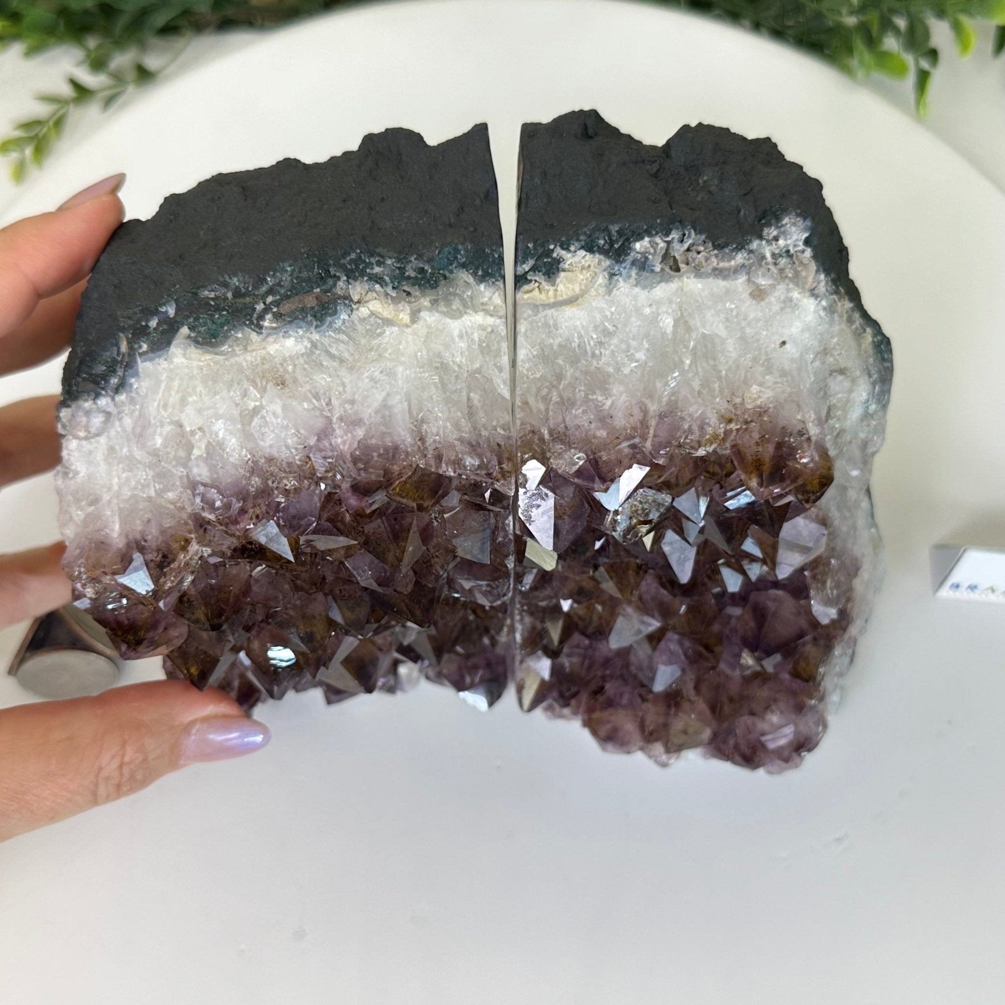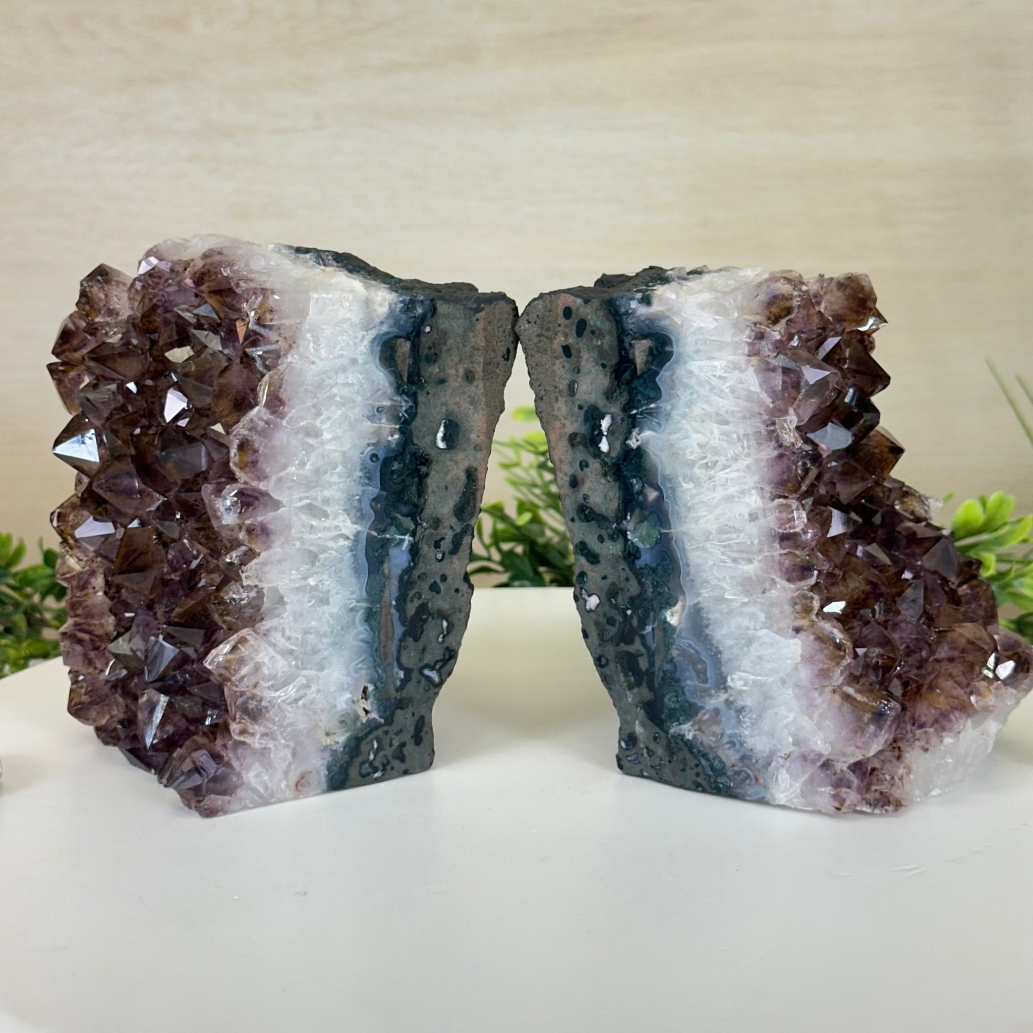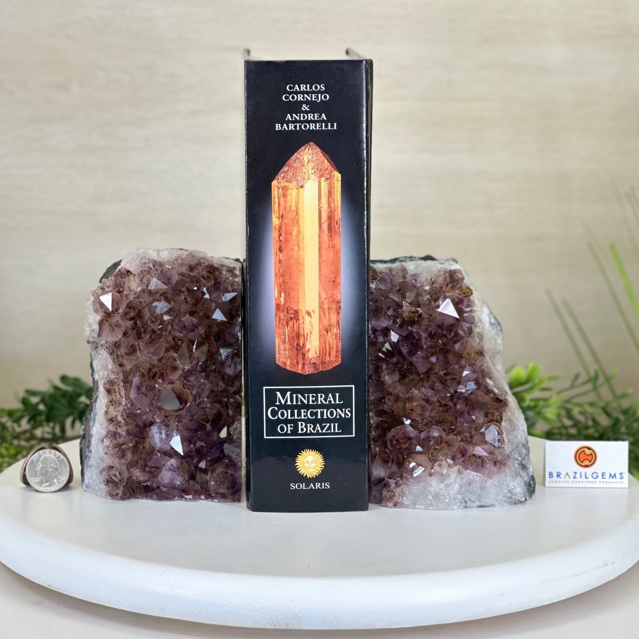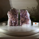 Formed from genuine Brazilian amethyst geodes, these Amethyst Crystal bookends showcase sparkling drusy crystal points across the front, with interior sides and bases polished smooth for balance and stability. Each pair highlights amethyst’s natural purple hues, blending raw crystal beauty with refined craftsmanship.