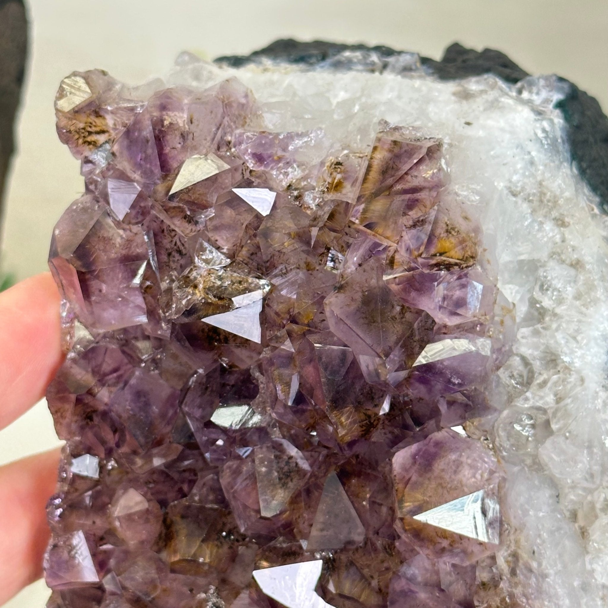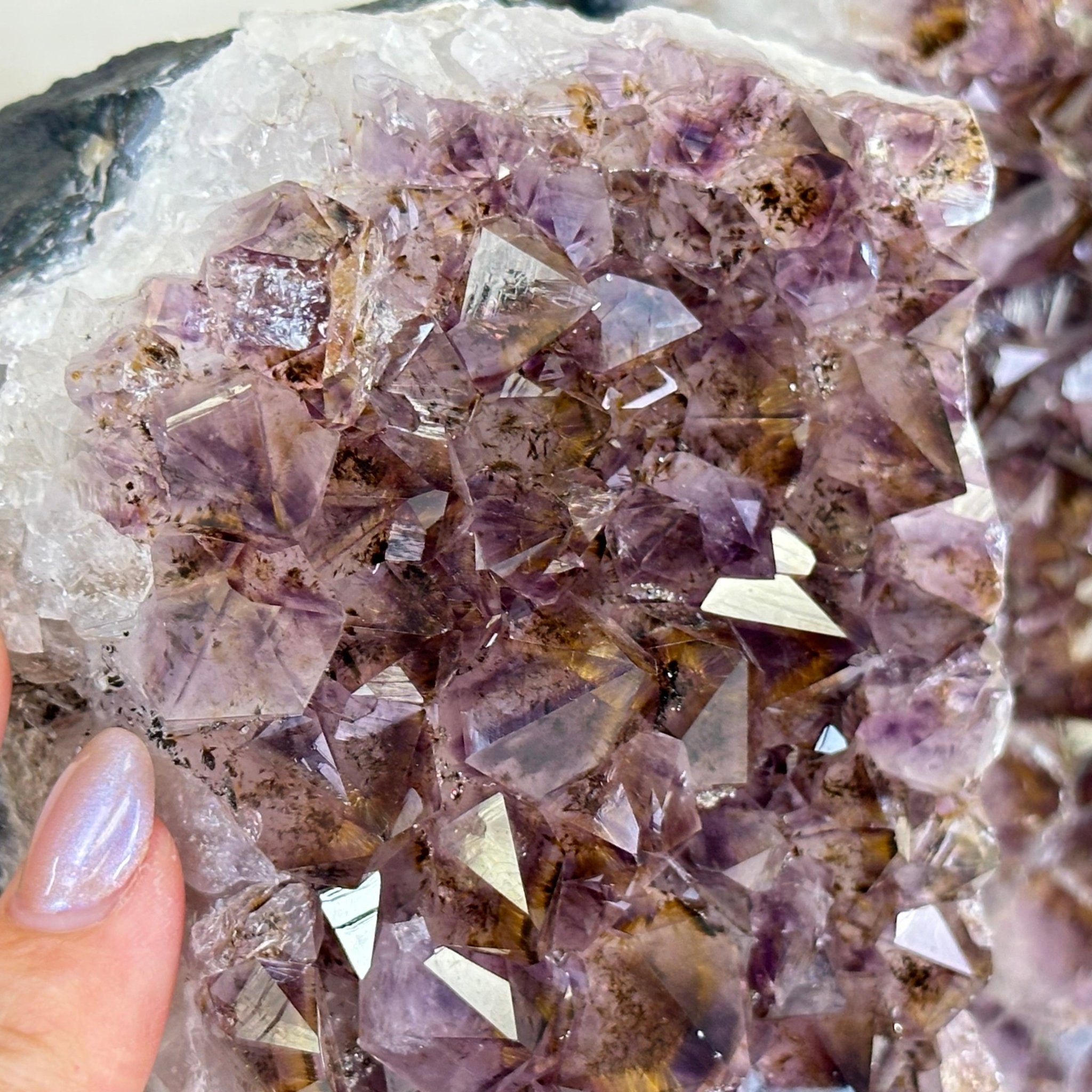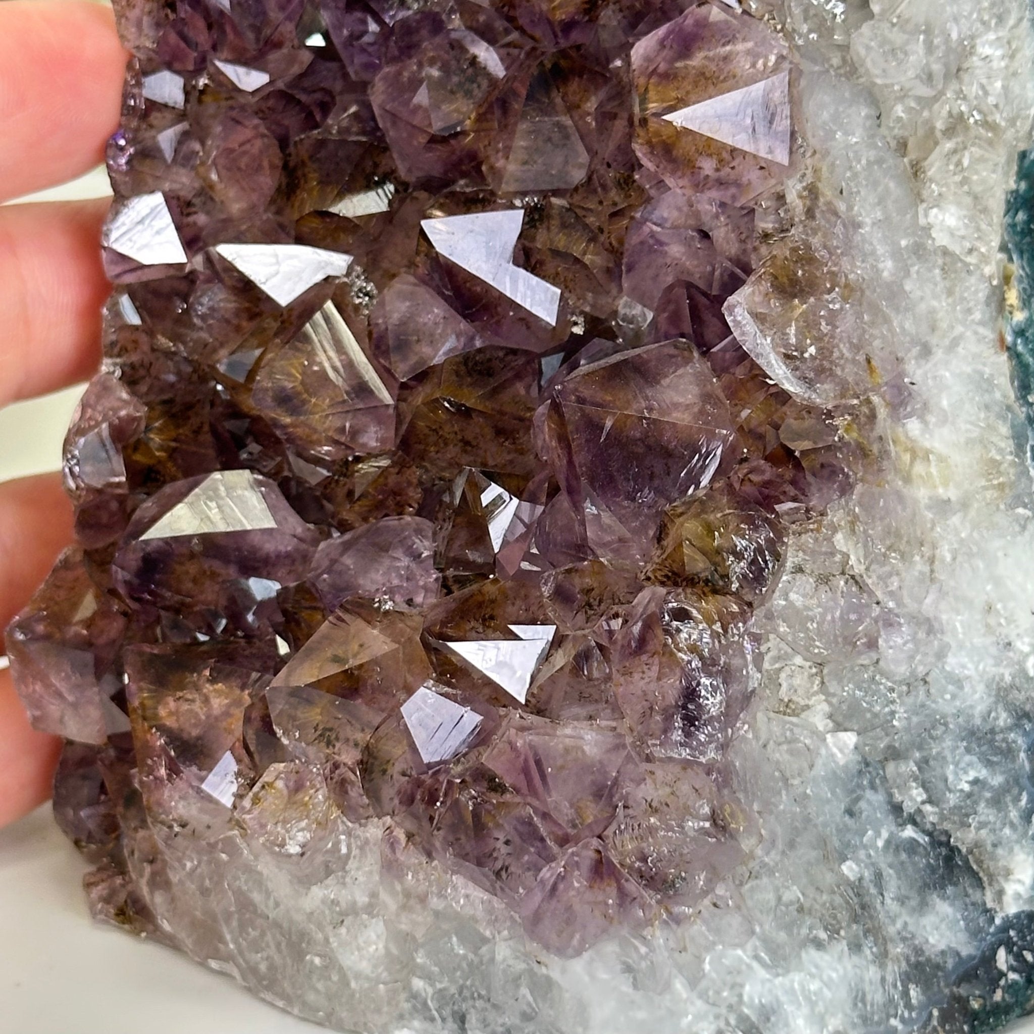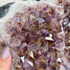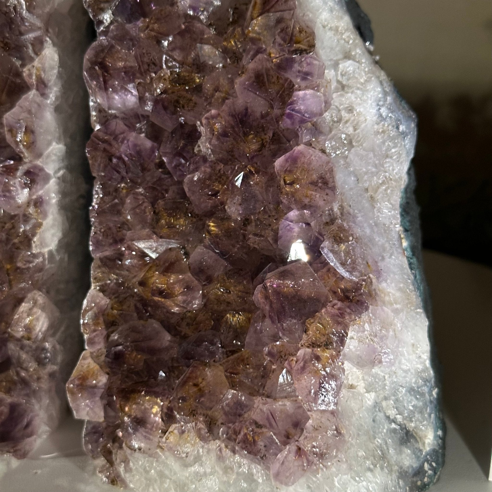 Formed from genuine Brazilian amethyst geodes, these Amethyst Crystal bookends showcase sparkling drusy crystal points across the front, with interior sides and bases polished smooth for balance and stability. Each pair highlights amethyst’s natural purple hues, blending raw crystal beauty with refined craftsmanship.
