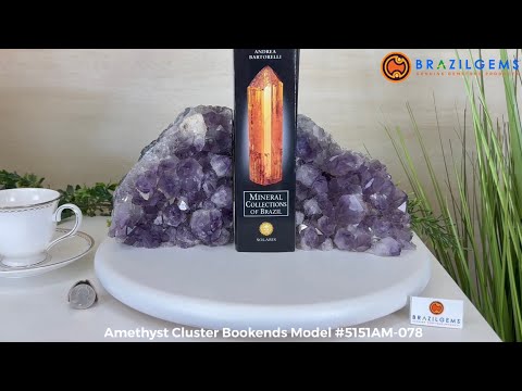 Formed from genuine Brazilian amethyst geodes, these Amethyst Crystal bookends showcase sparkling drusy crystal points across the front, with interior sides and bases polished smooth for balance and stability. Each pair highlights amethyst’s natural purple hues, blending raw crystal beauty with refined craftsmanship.
