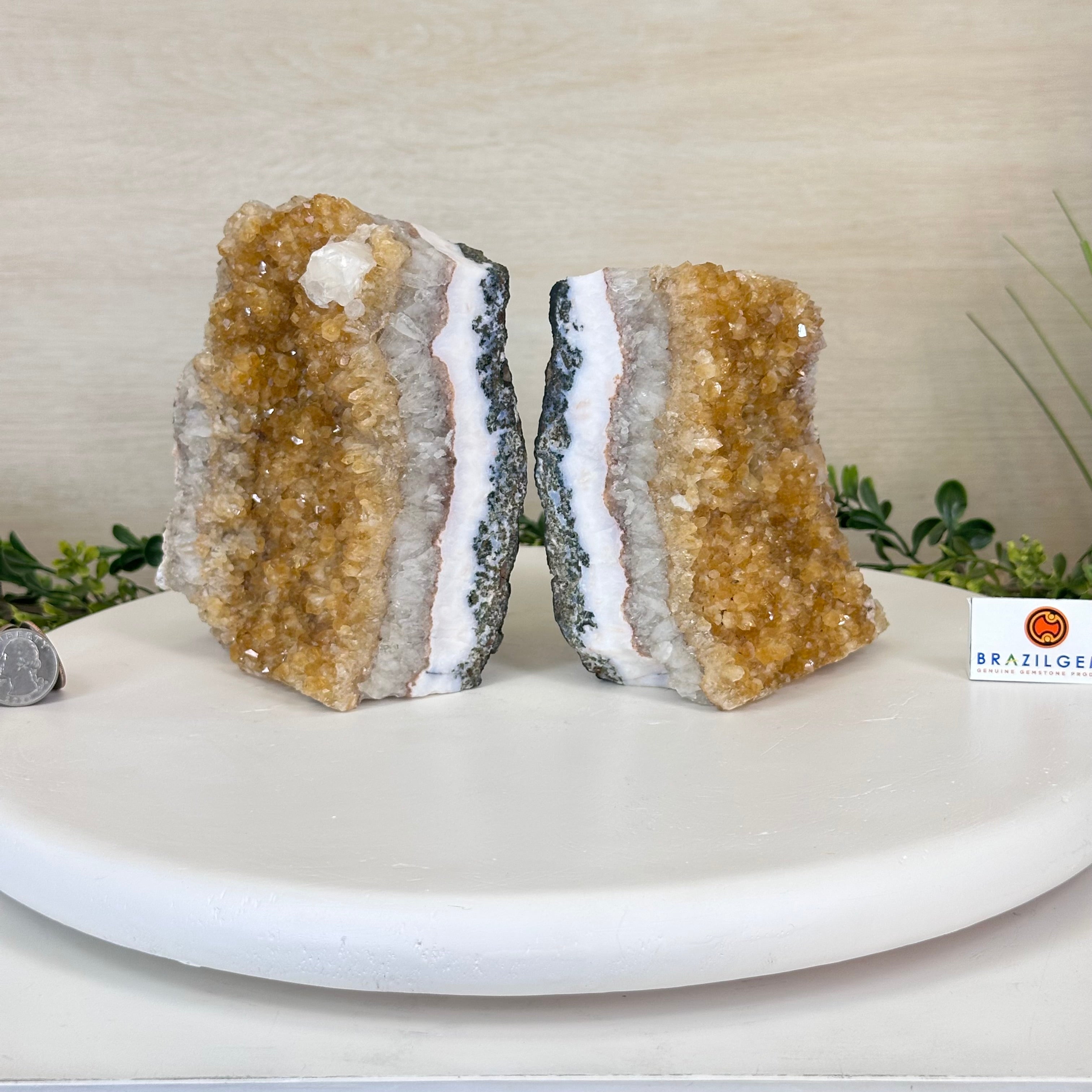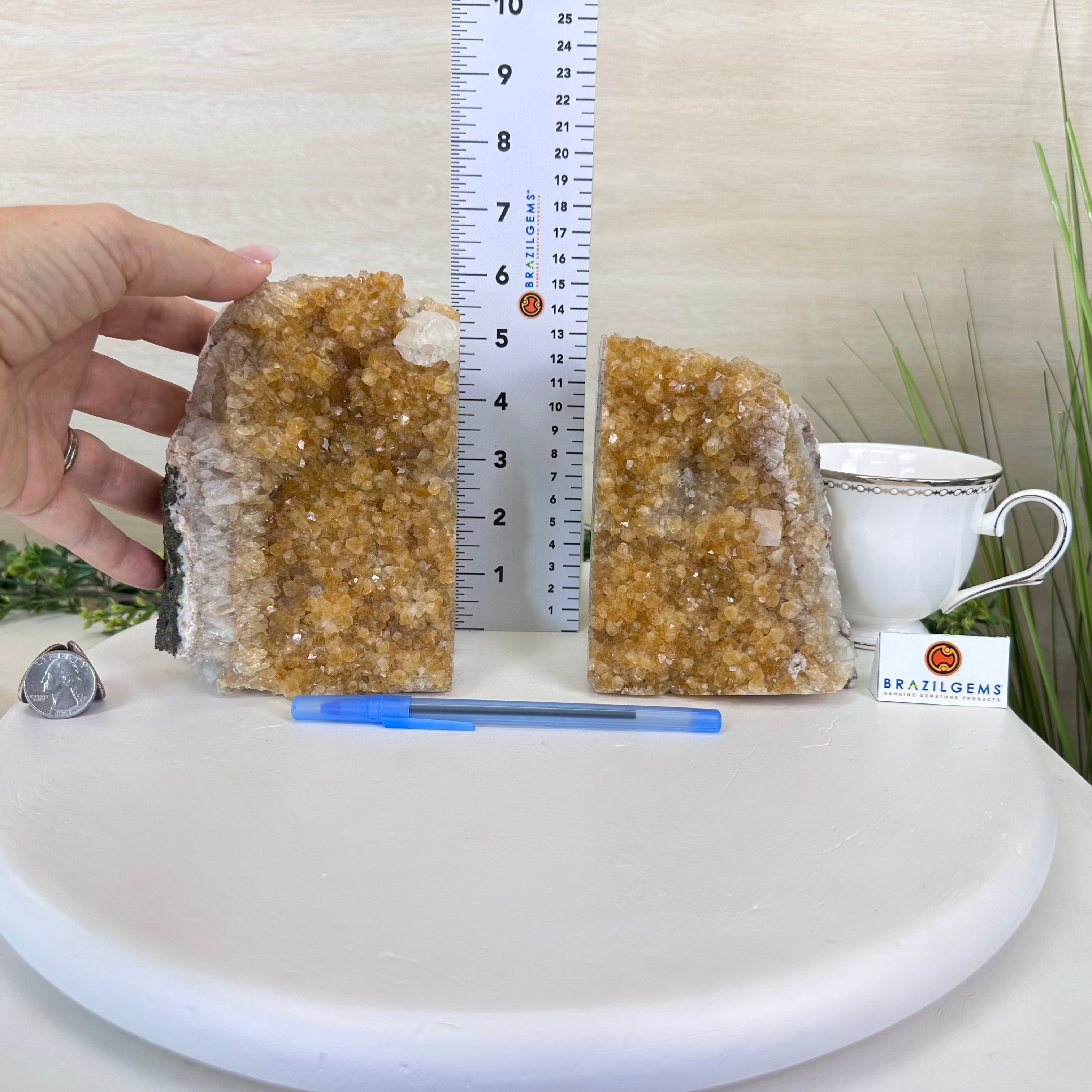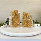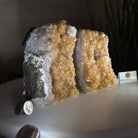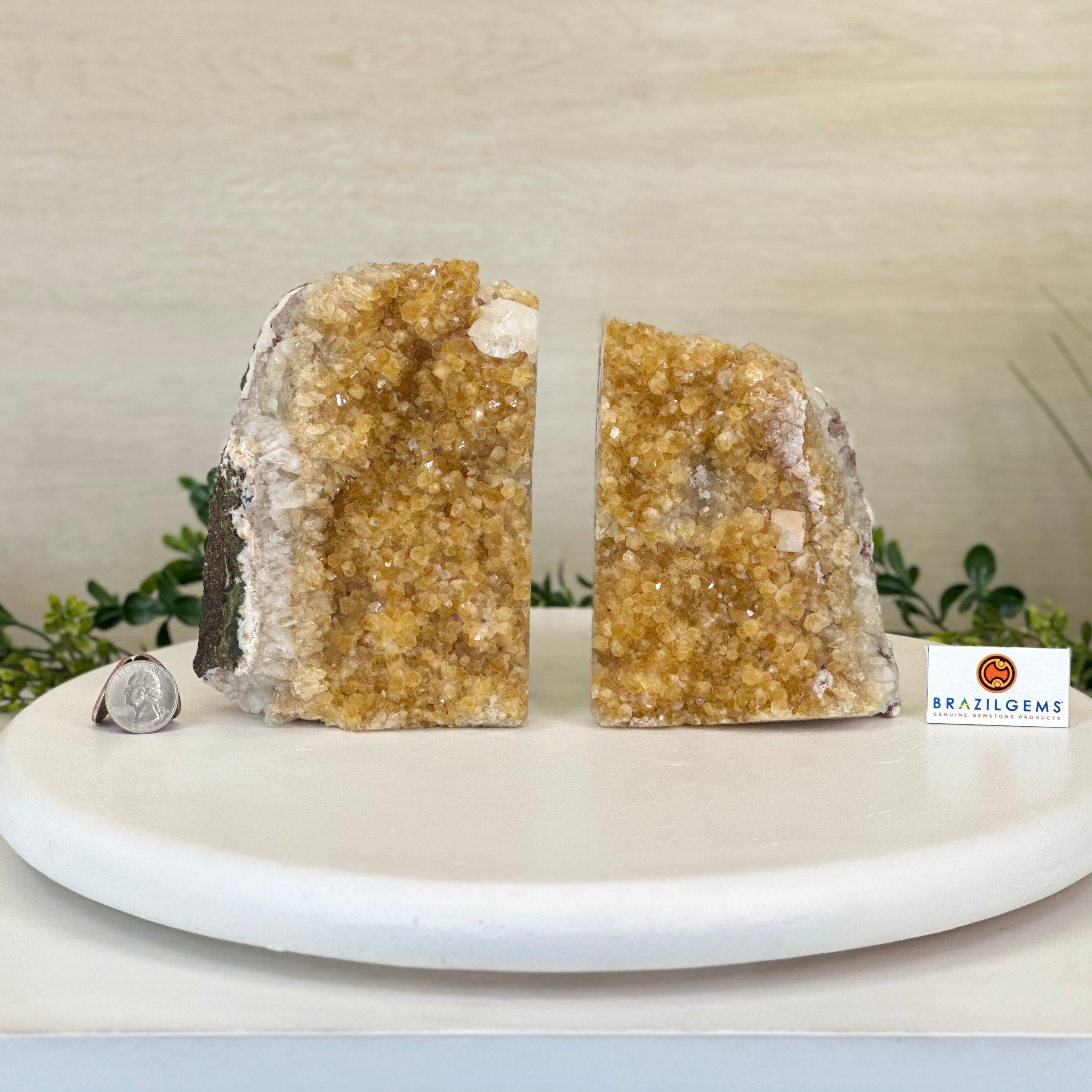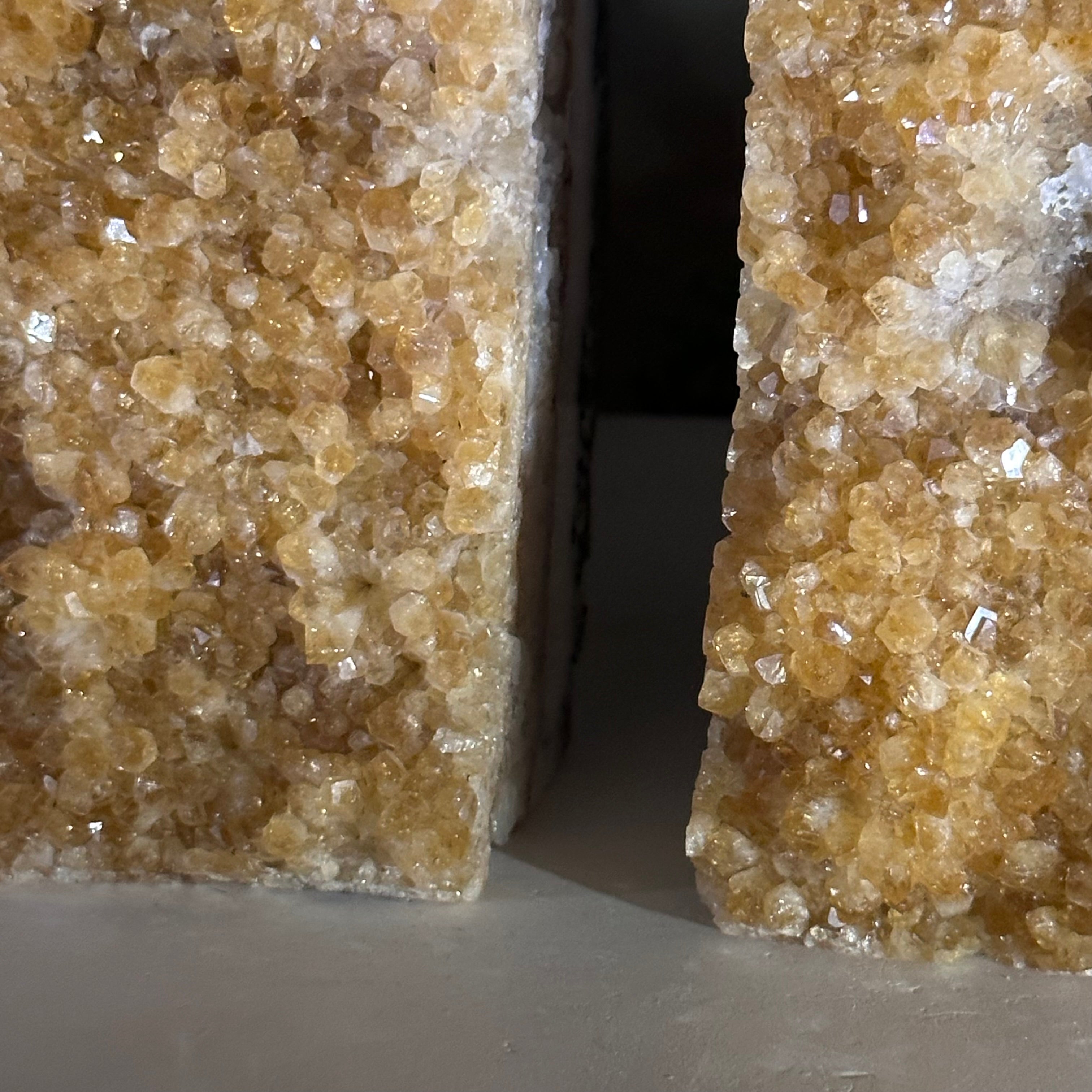 Formed from genuine Brazilian citrine geodes, these Citrine Crystal bookends showcase sparkling drusy points across the front, with interior sides and bases polished smooth for balance and stability. Each pair reveals citrine’s warm amber and golden hues, blending raw crystal radiance with refined craftsmanship. As is the case for the majority of Citrine on the market from Brazil, this Citrine has been heated to give it its beautiful amber color.
