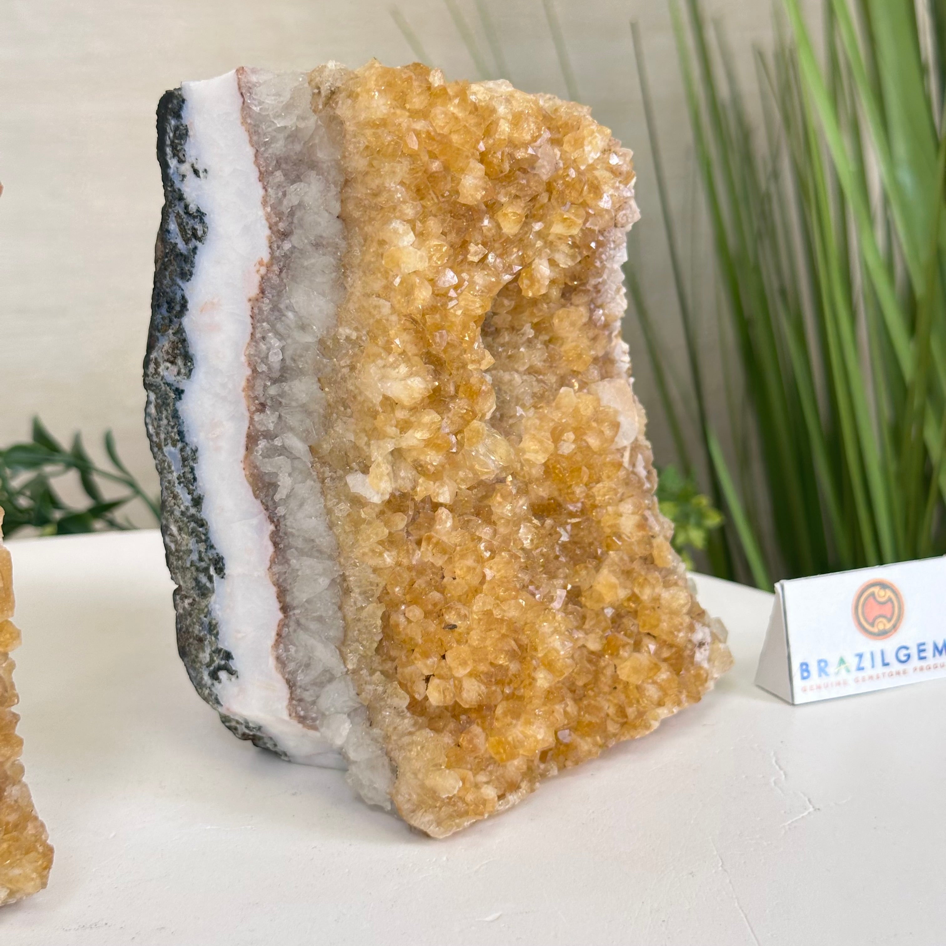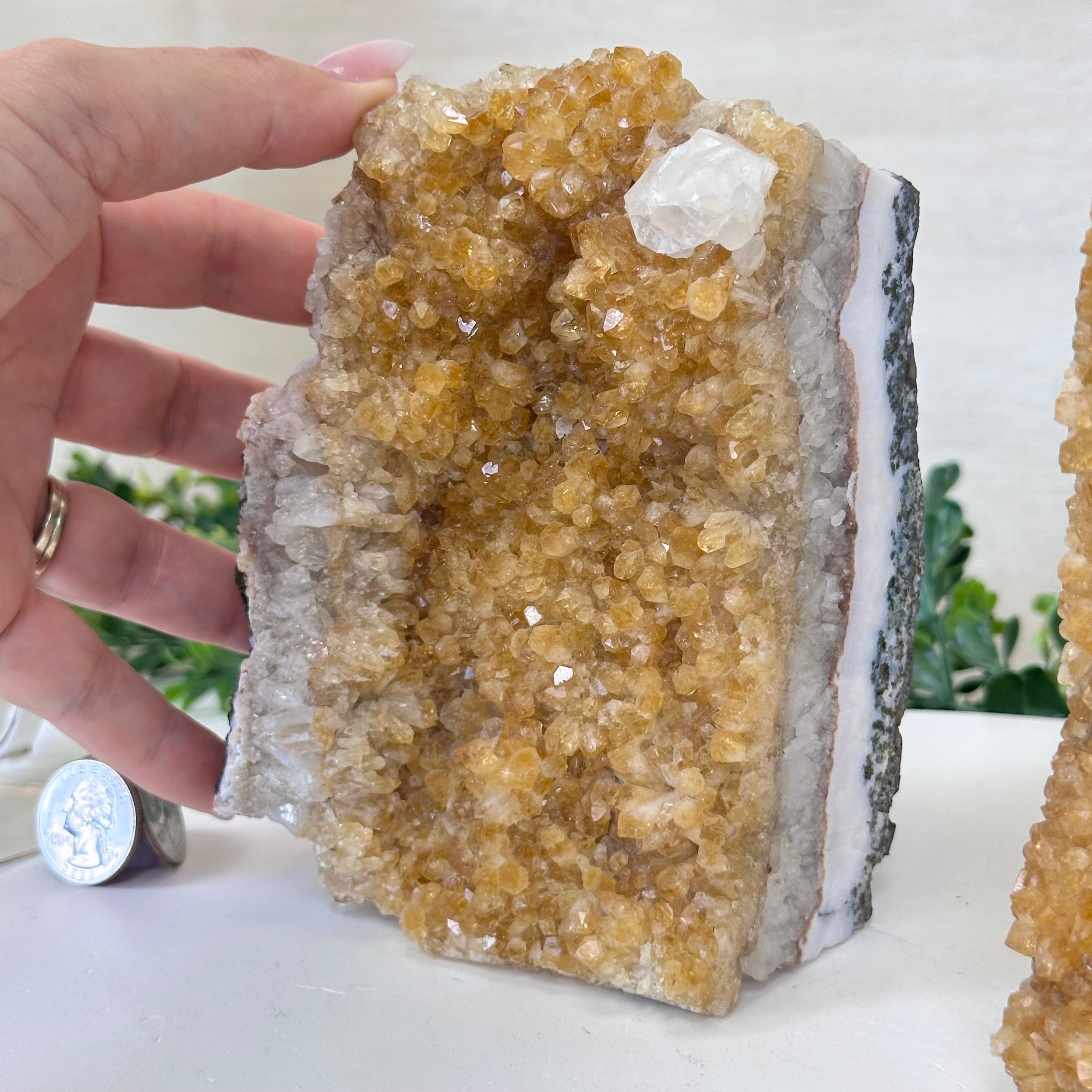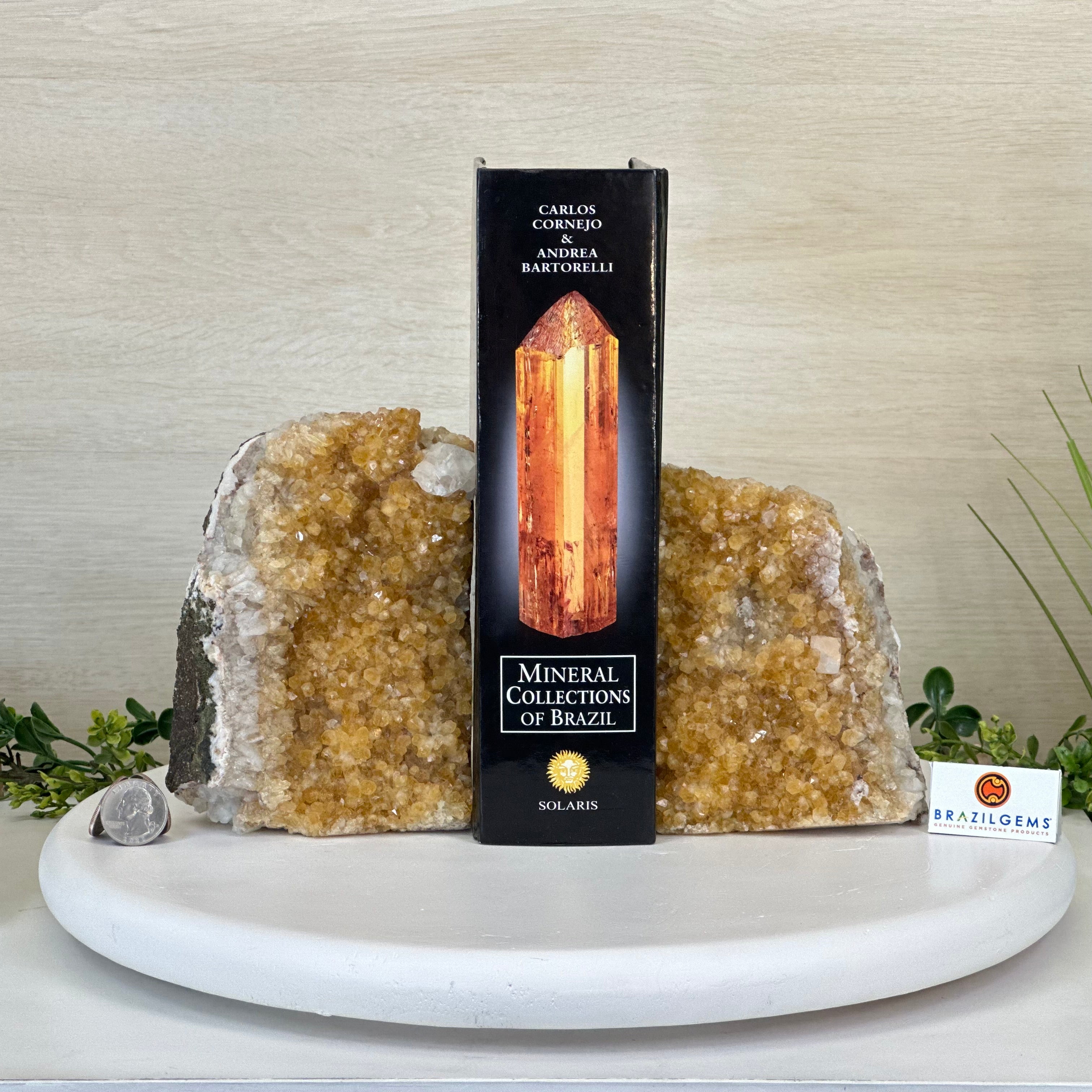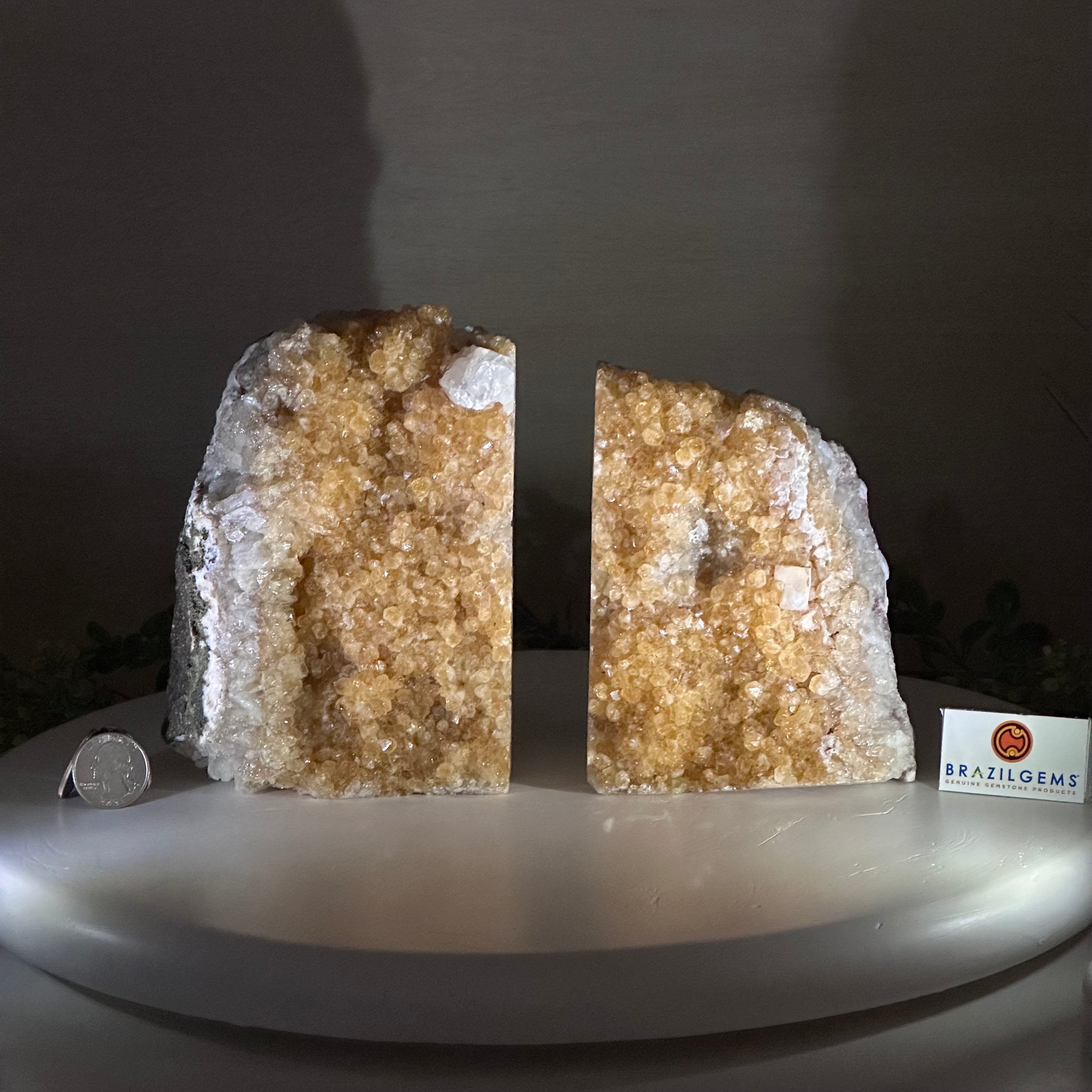 Formed from genuine Brazilian citrine geodes, these Citrine Crystal bookends showcase sparkling drusy points across the front, with interior sides and bases polished smooth for balance and stability. Each pair reveals citrine’s warm amber and golden hues, blending raw crystal radiance with refined craftsmanship. As is the case for the majority of Citrine on the market from Brazil, this Citrine has been heated to give it its beautiful amber color.