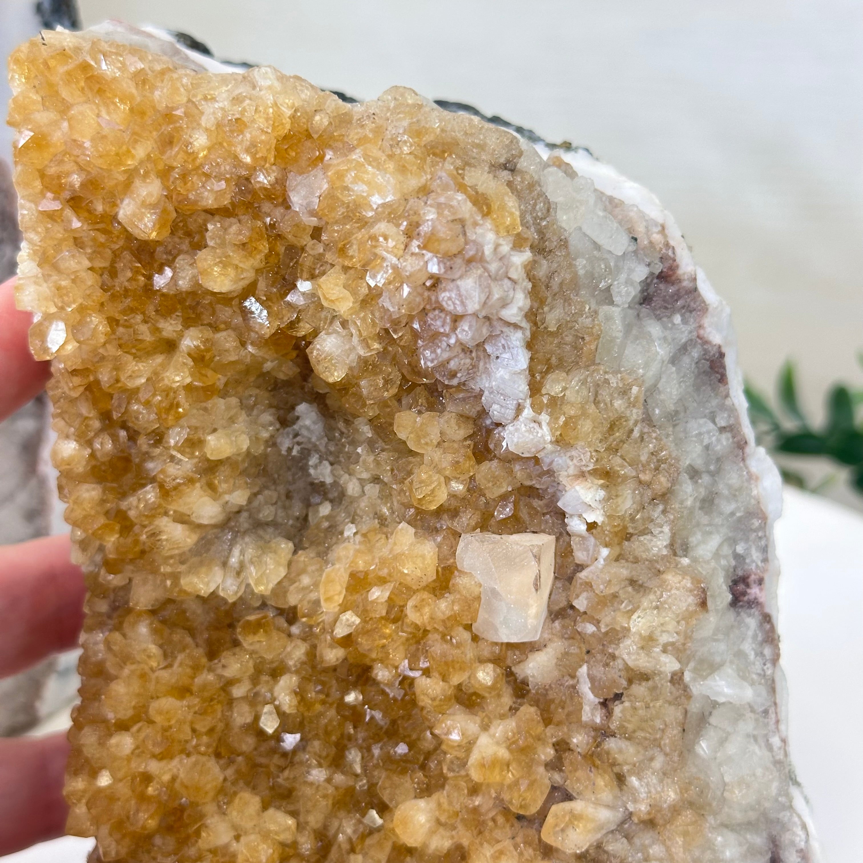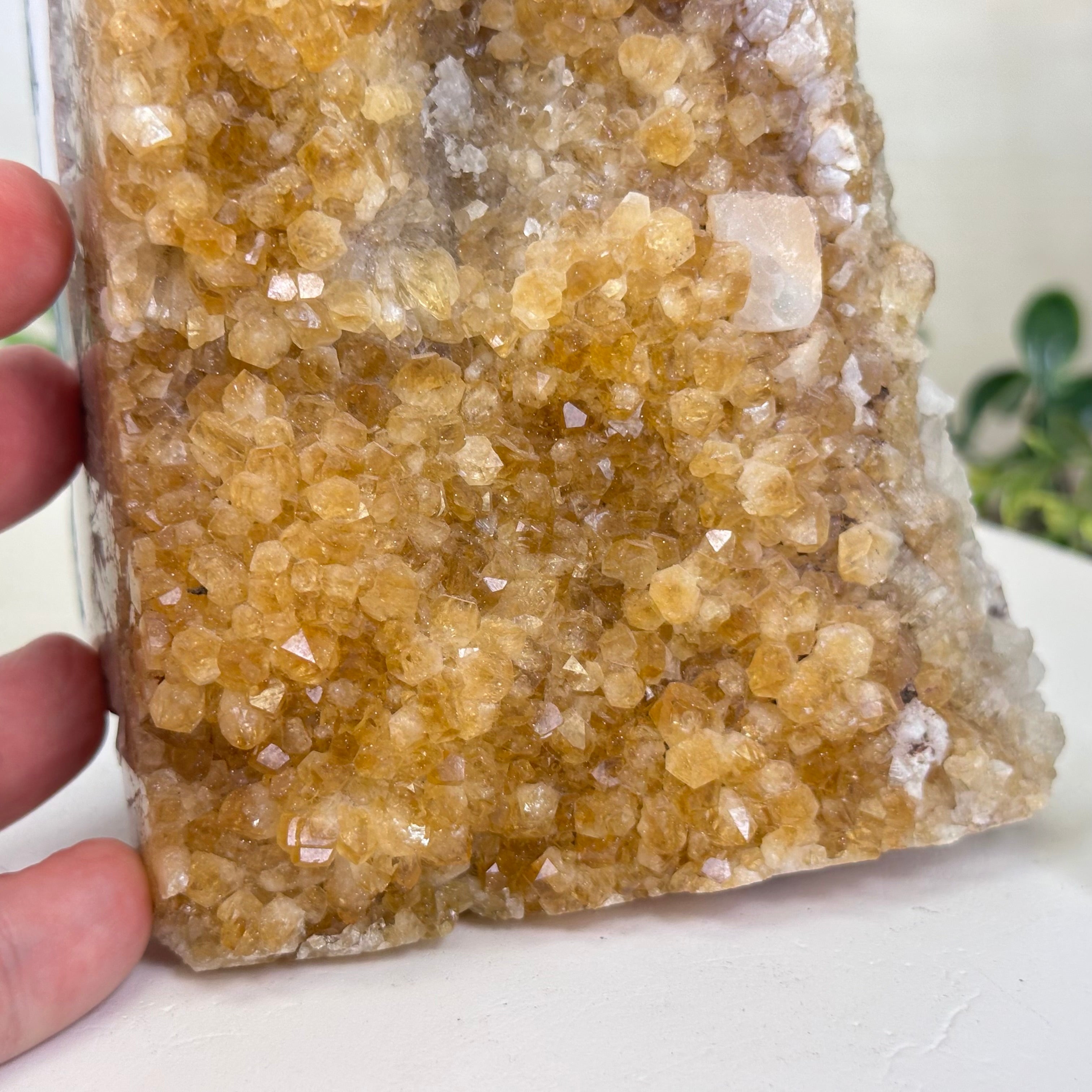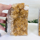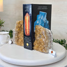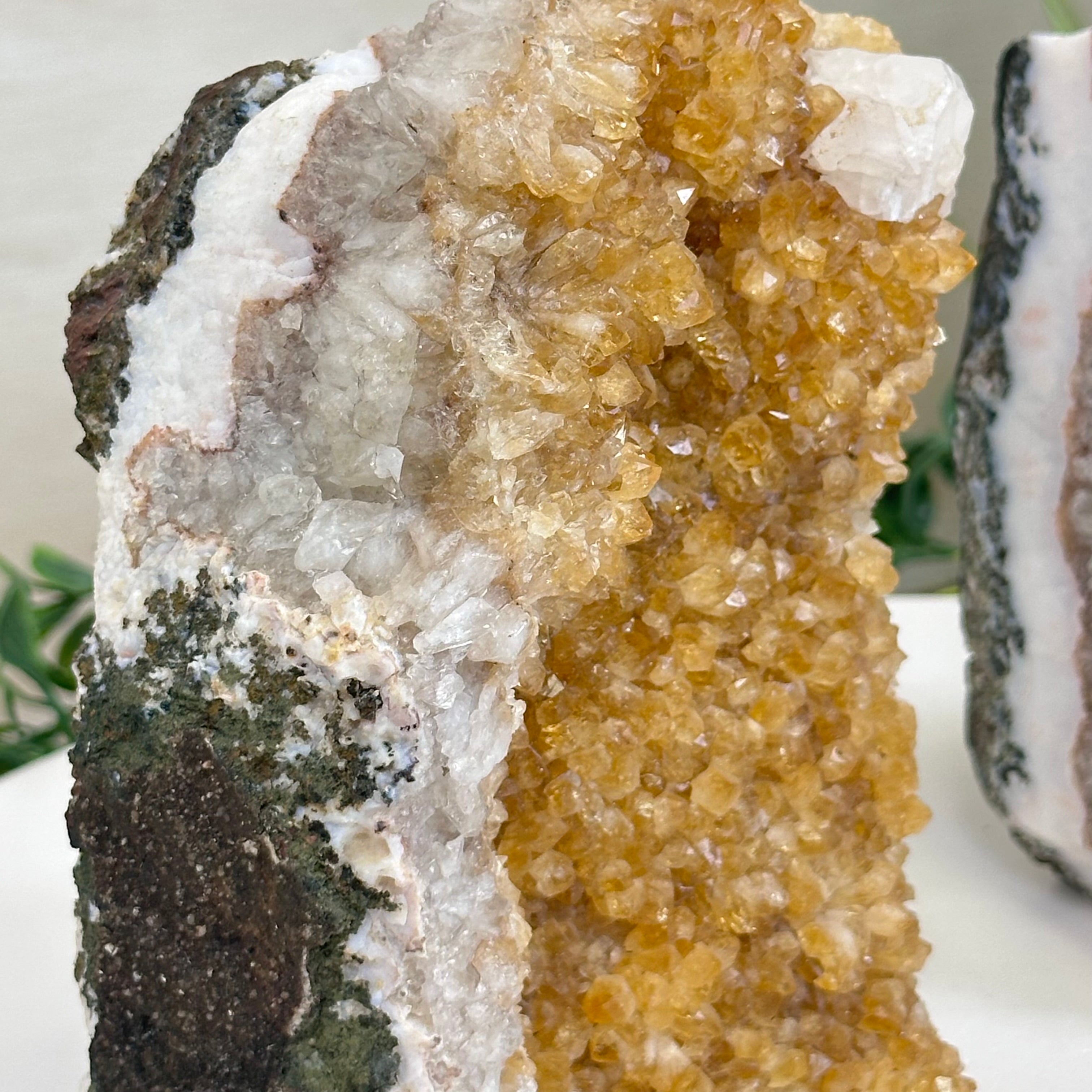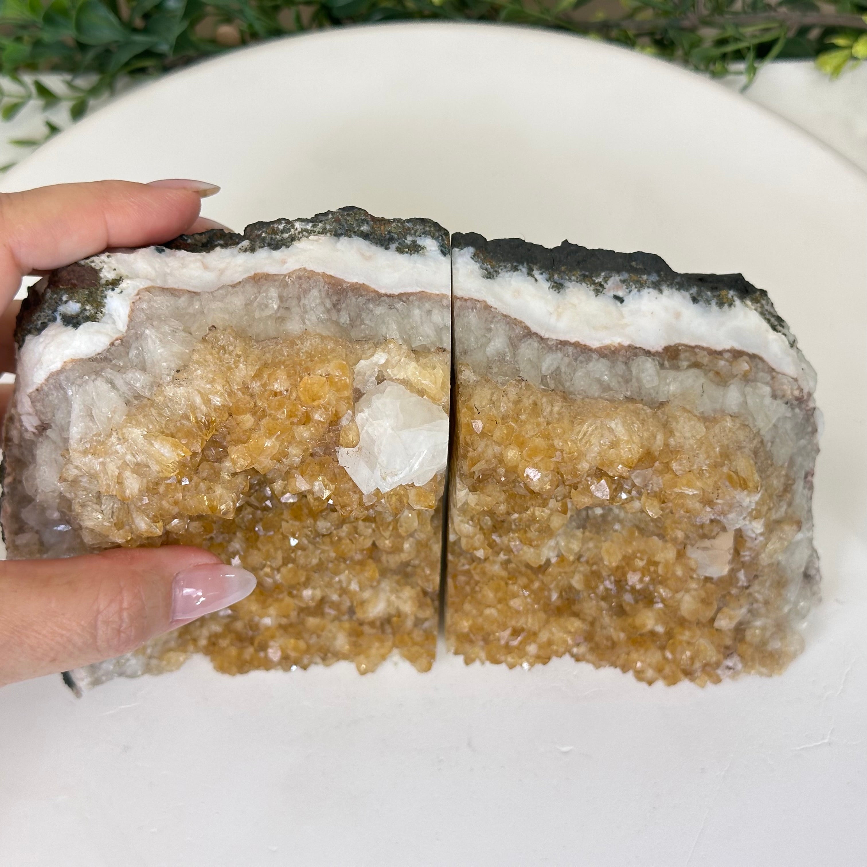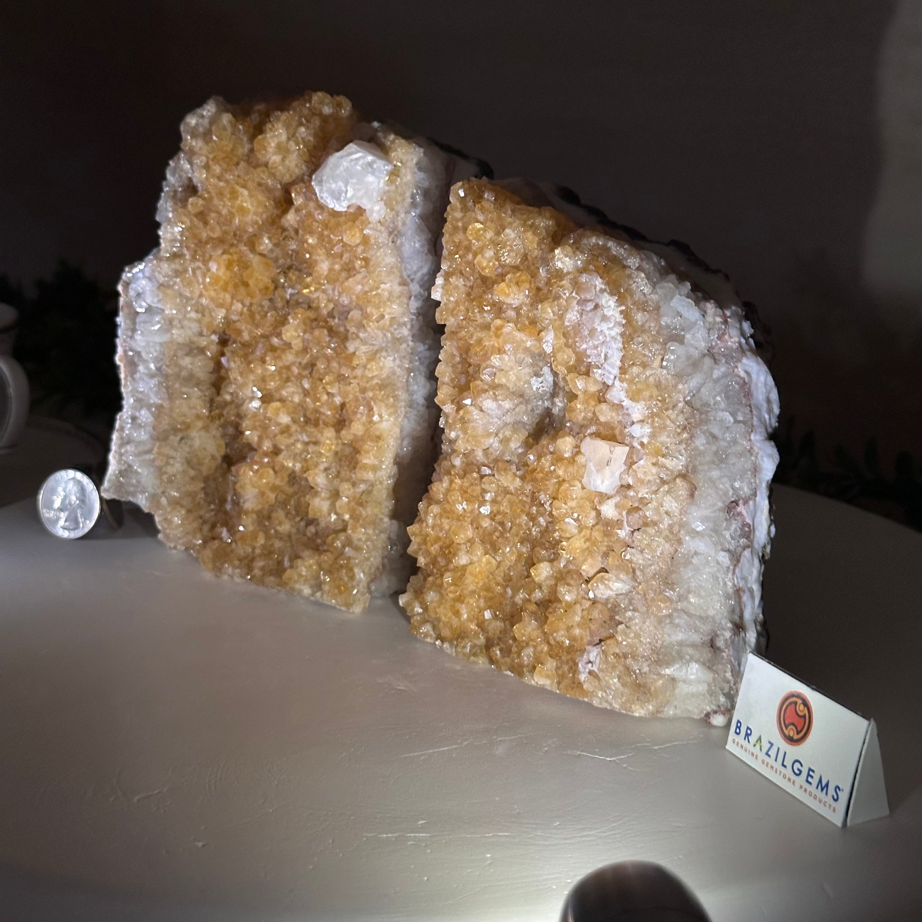 Formed from genuine Brazilian citrine geodes, these Citrine Crystal bookends showcase sparkling drusy points across the front, with interior sides and bases polished smooth for balance and stability. Each pair reveals citrine’s warm amber and golden hues, blending raw crystal radiance with refined craftsmanship. As is the case for the majority of Citrine on the market from Brazil, this Citrine has been heated to give it its beautiful amber color.