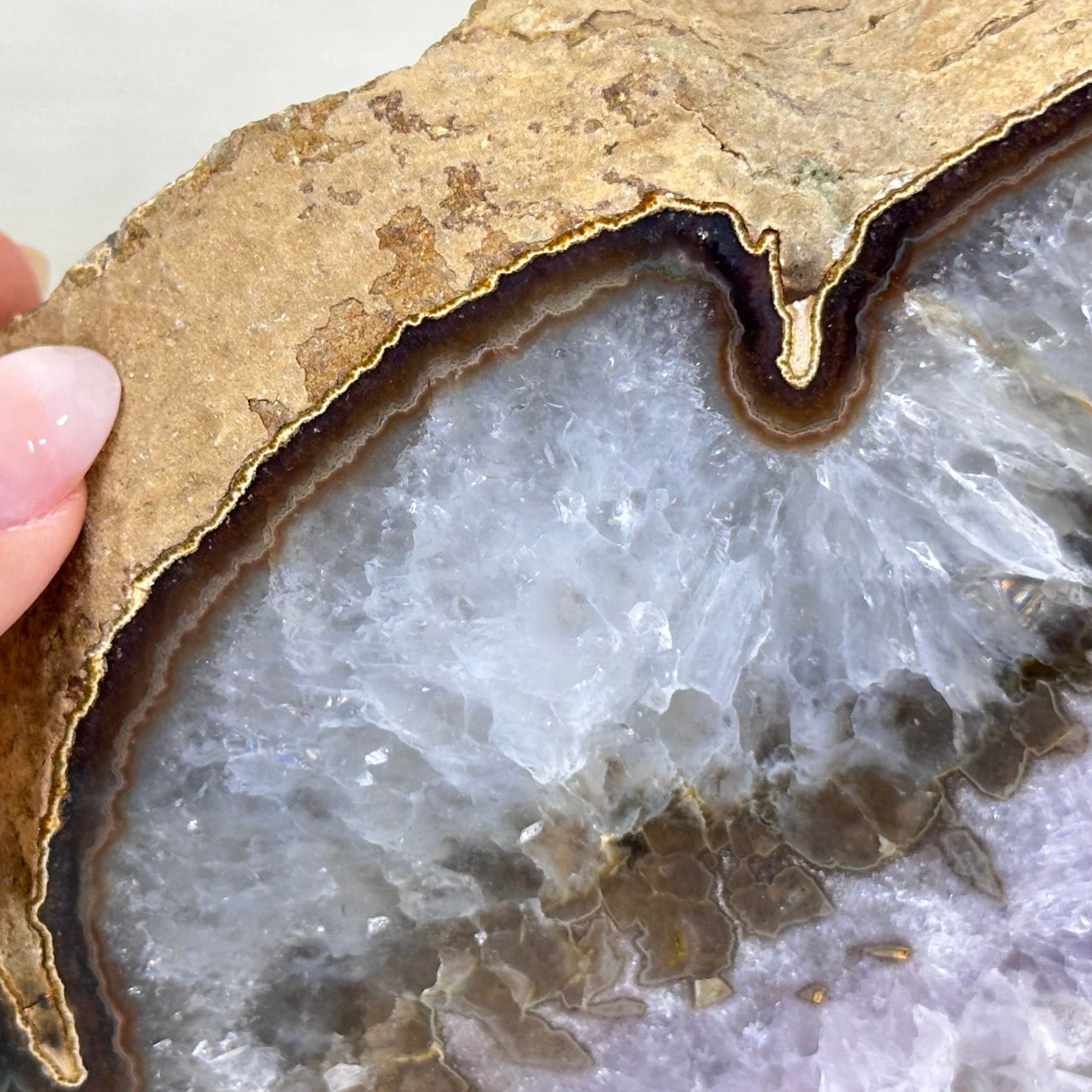 Agate, with its vibrant array of colors and intricate banding, is a stone of protection, strength, and courage. Known to offer a sense of security, it acts as a talisman during both challenging and peaceful times. Whether you're navigating periods of worry or overthinking, Agate invites healing energy to calm the mind and restore balance. It forms in ancient volcanic rocks, where over time, mineral-rich waters pass through cavities, creating the stone’s characteristic layered appearance. Each unique band reflects the power of strength built slowly and steadily, making it a reminder of resilience and enduring stability.