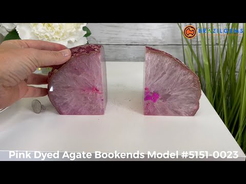 Crafted from a single piece of genuine Brazilian agate, these bookends are cut in half and polished to reveal mesmerizing bands of color. Each set is unique, with striking patterns enhanced by a rich Pink dye.