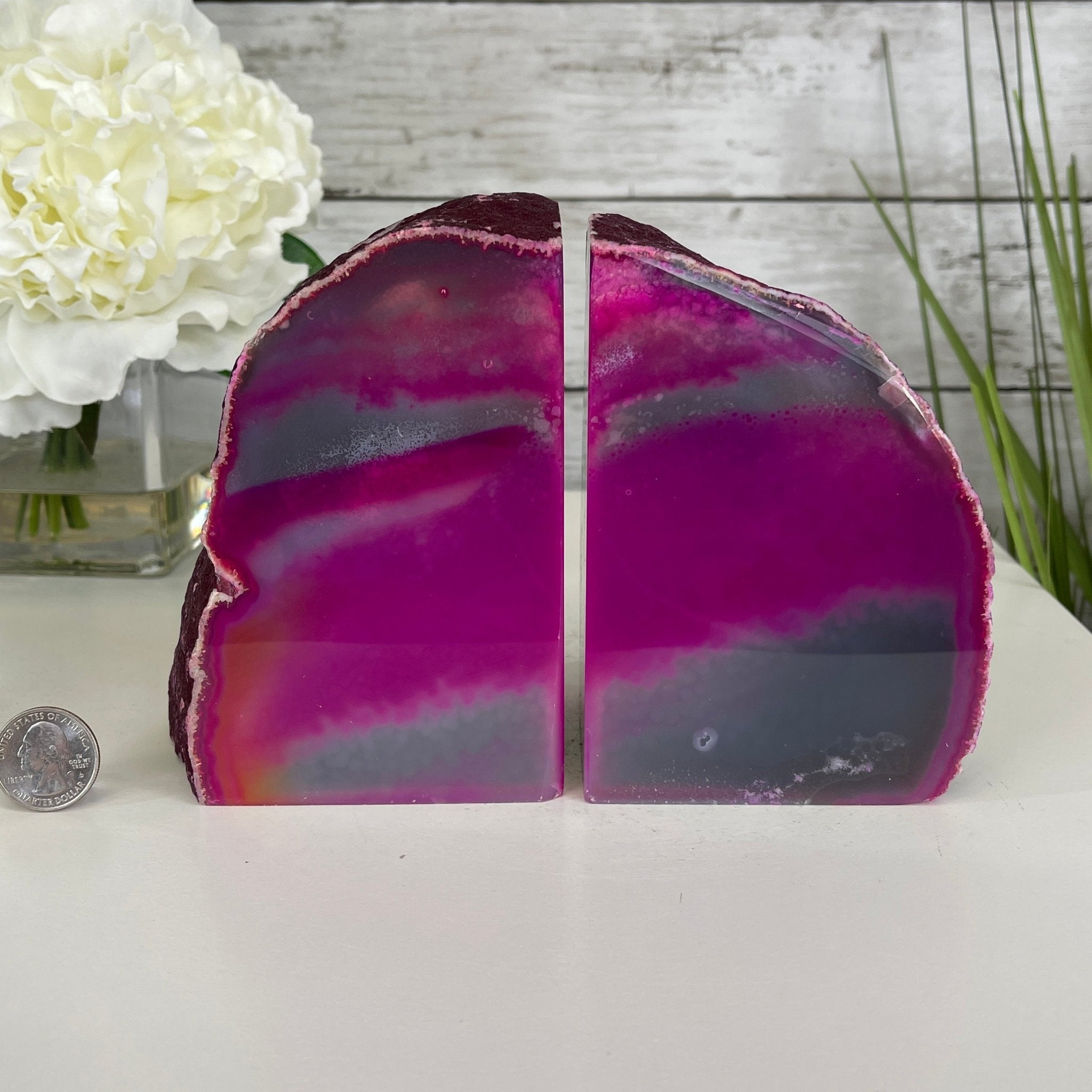 Crafted from a single piece of genuine Brazilian agate, these bookends are cut in half and polished to reveal mesmerizing bands of color. Each set is unique, with striking patterns enhanced by a rich Pink dye.
