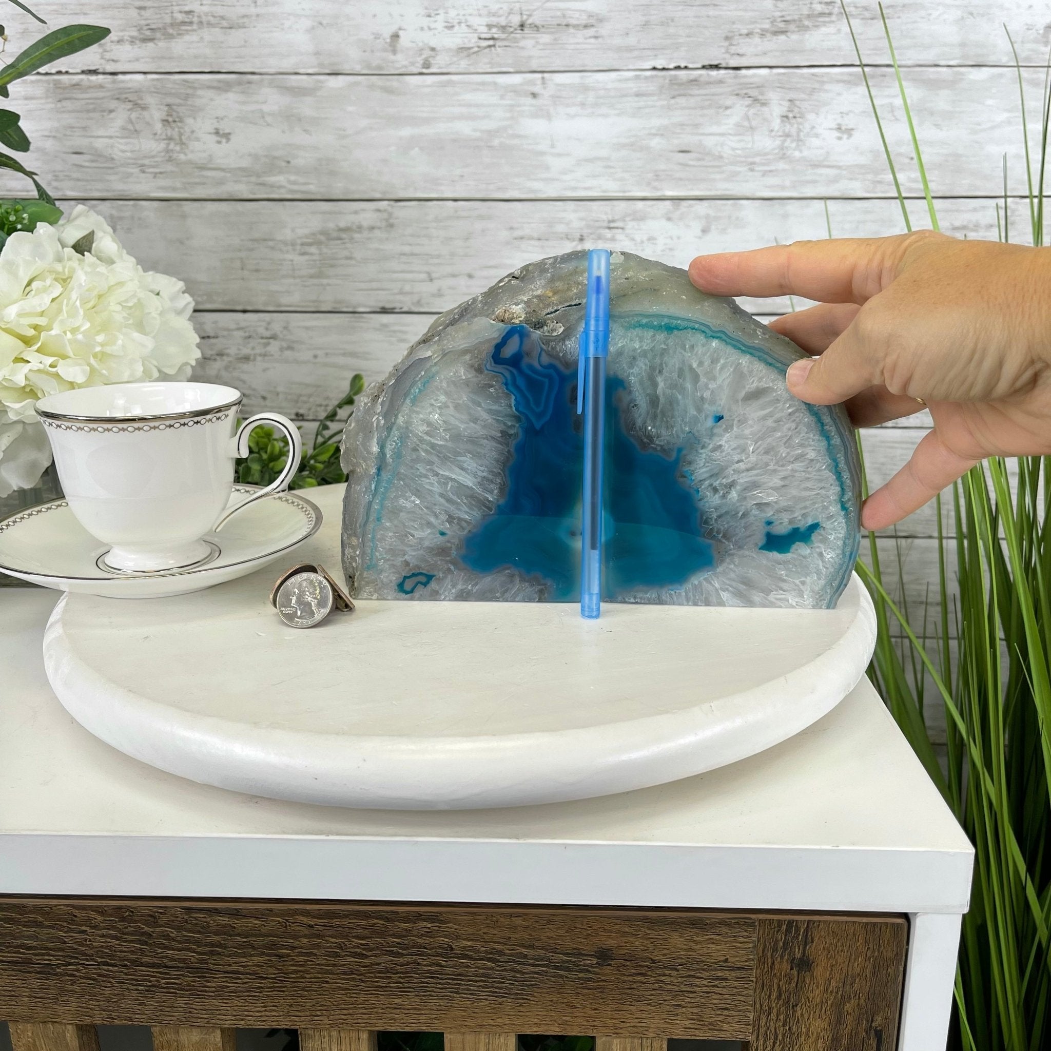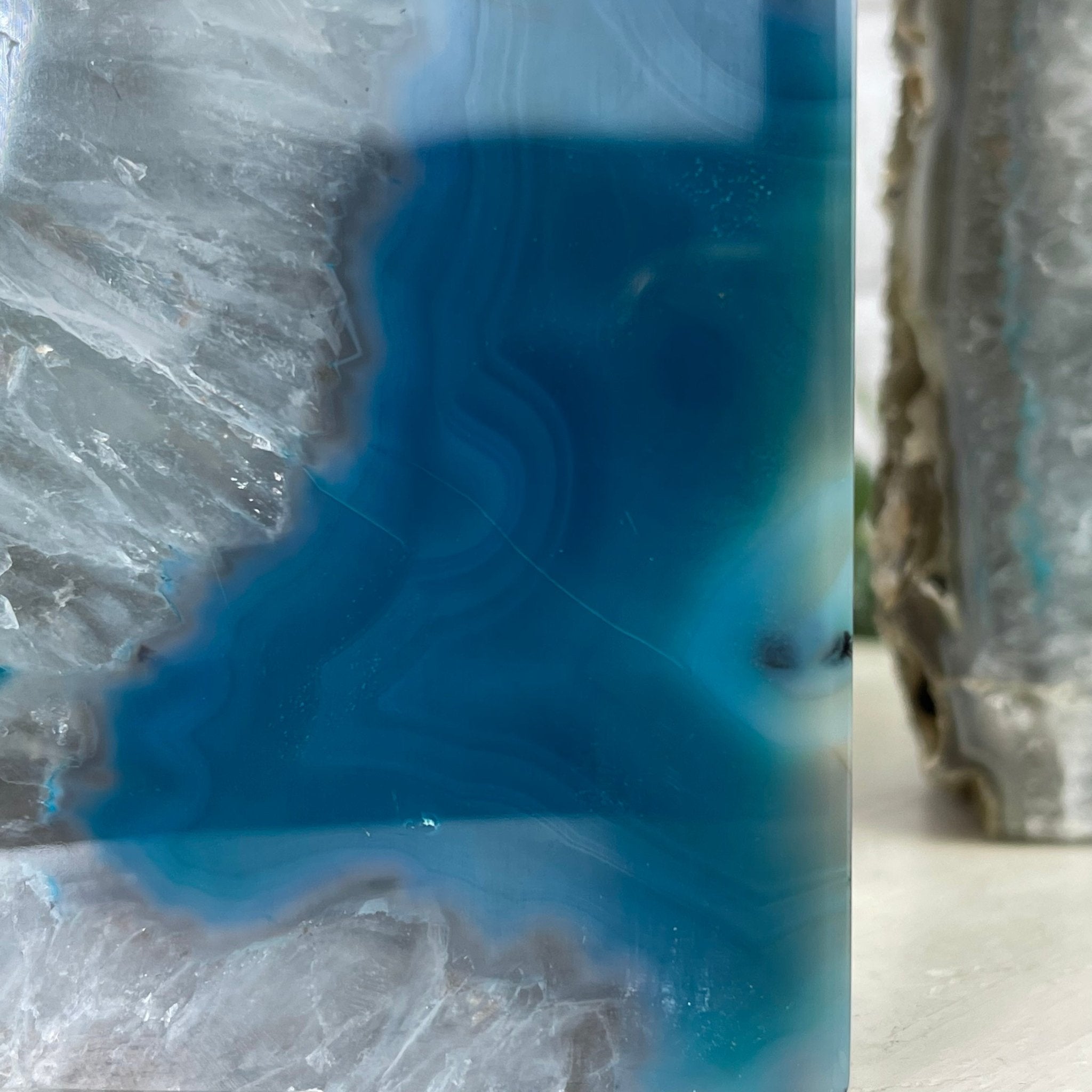 Crafted from a single piece of genuine Brazilian agate, these bookends are cut in half and polished to reveal mesmerizing bands of color. Each set is unique, with striking patterns enhanced by a rich Teal dye.