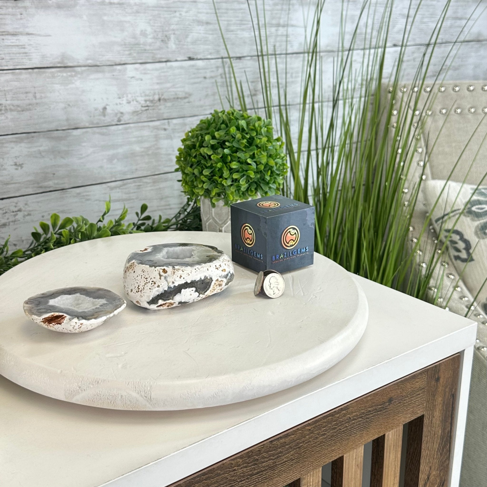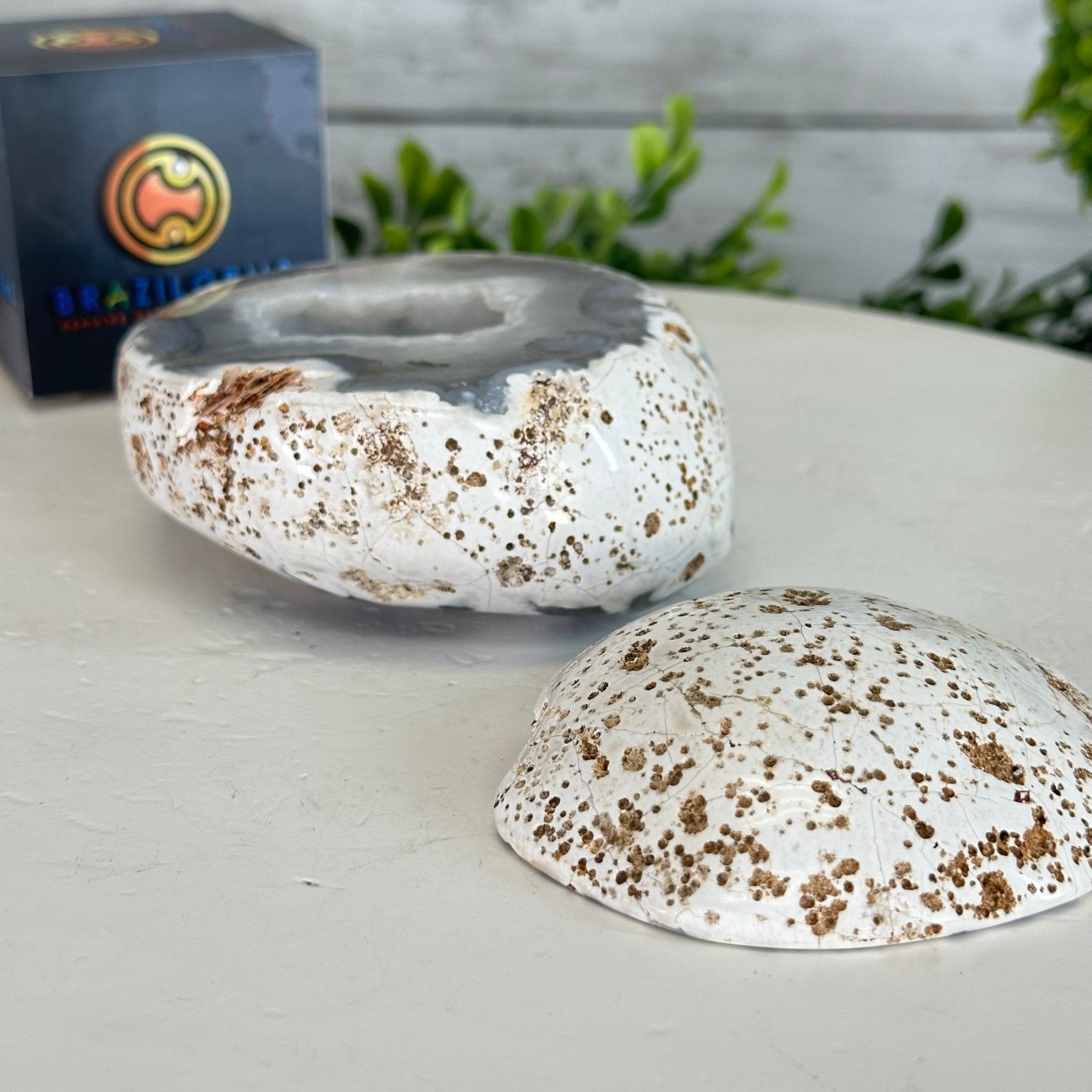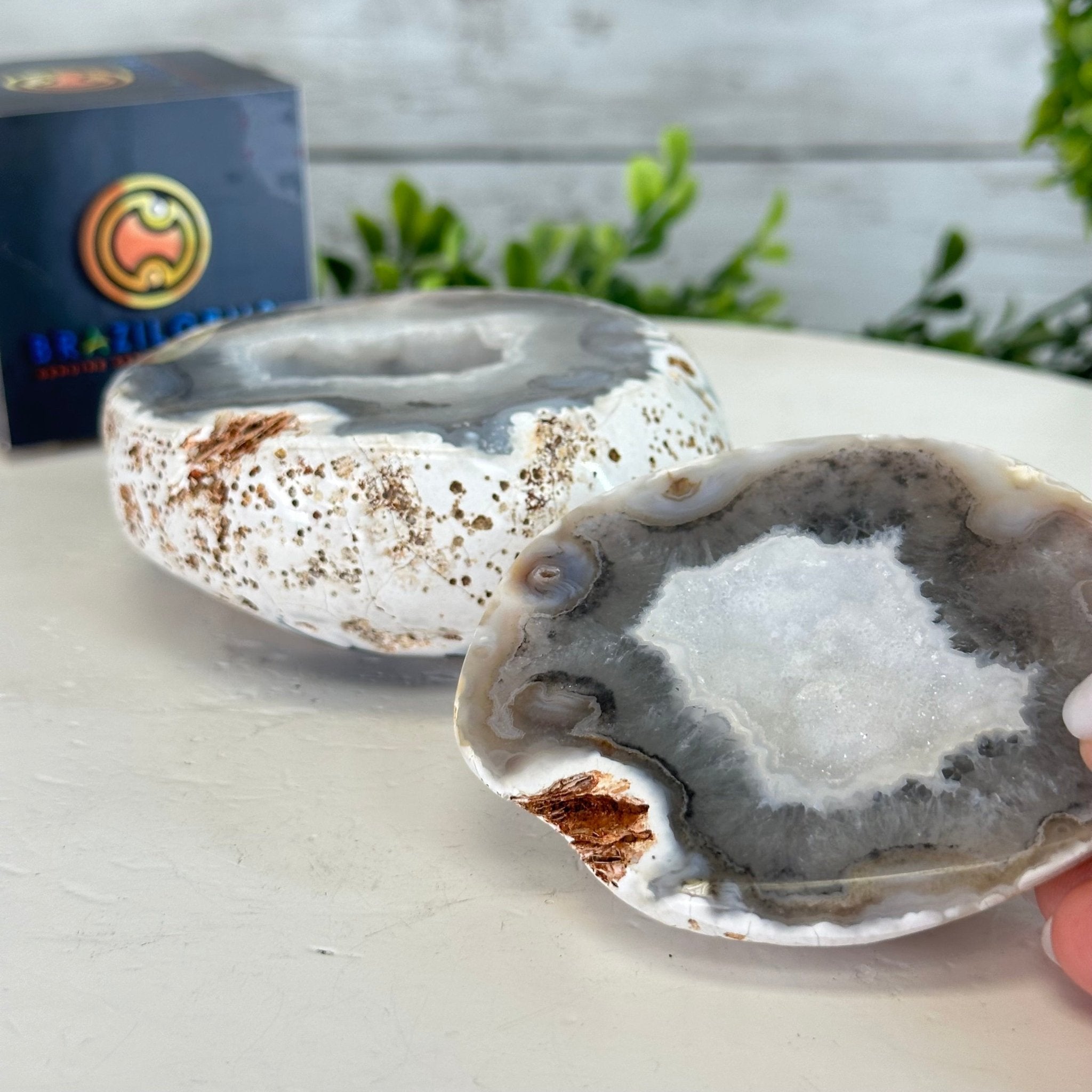 Brazil Gems® brings you this Polished Brazilian Agate Geode "Jewelry Box". It is a whole agate gemstone cut into two pieces with the lid not attached to the geode. The natural outer shell looks as amazing as the crystals inside.