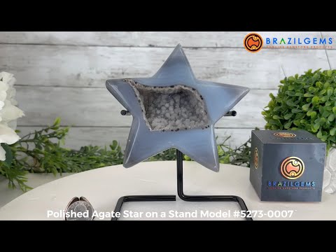 This is a polished Brazilian Agate Geode perfectly handcrafted into the shape of a Star then placed on a black metal stand. With its polished edges and natural crystals shining through you'll enjoy this piece for years to come.