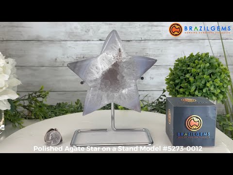 This is a polished Brazilian Agate Geode perfectly handcrafted into the shape of a Star then placed on a chrome metal stand. With its polished edges and natural crystals shining through you'll enjoy this piece for years to come.
