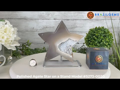 This is a polished Brazilian Agate Geode perfectly handcrafted into the shape of a Star then placed on a chrome metal stand. With its polished edges and natural crystals shining through you'll enjoy this piece for years to come.