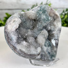 Extra Quality Heart-Shaped Amethyst Geode on a clear acrylic stand. This delicate gemstone has polished edges and the backside is its own natural stone.