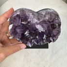 Extra Quality Heart-Shaped Amethyst Geode on a black metal stand. This beautiful gemstone has polished edges and it's backside exposes its natural rough stone on the back. It also features vibrant violet colors and nicely shaped crystal points.