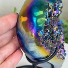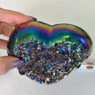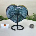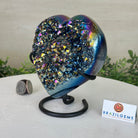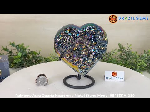Add a touch of enchantment to your crystal collection with Brazil Gems® Rainbow Aura Quartz Heart on a black metal stand. This captivating piece features polished edges and drusy crystals that glisten with an iridescent rainbow aura effect.