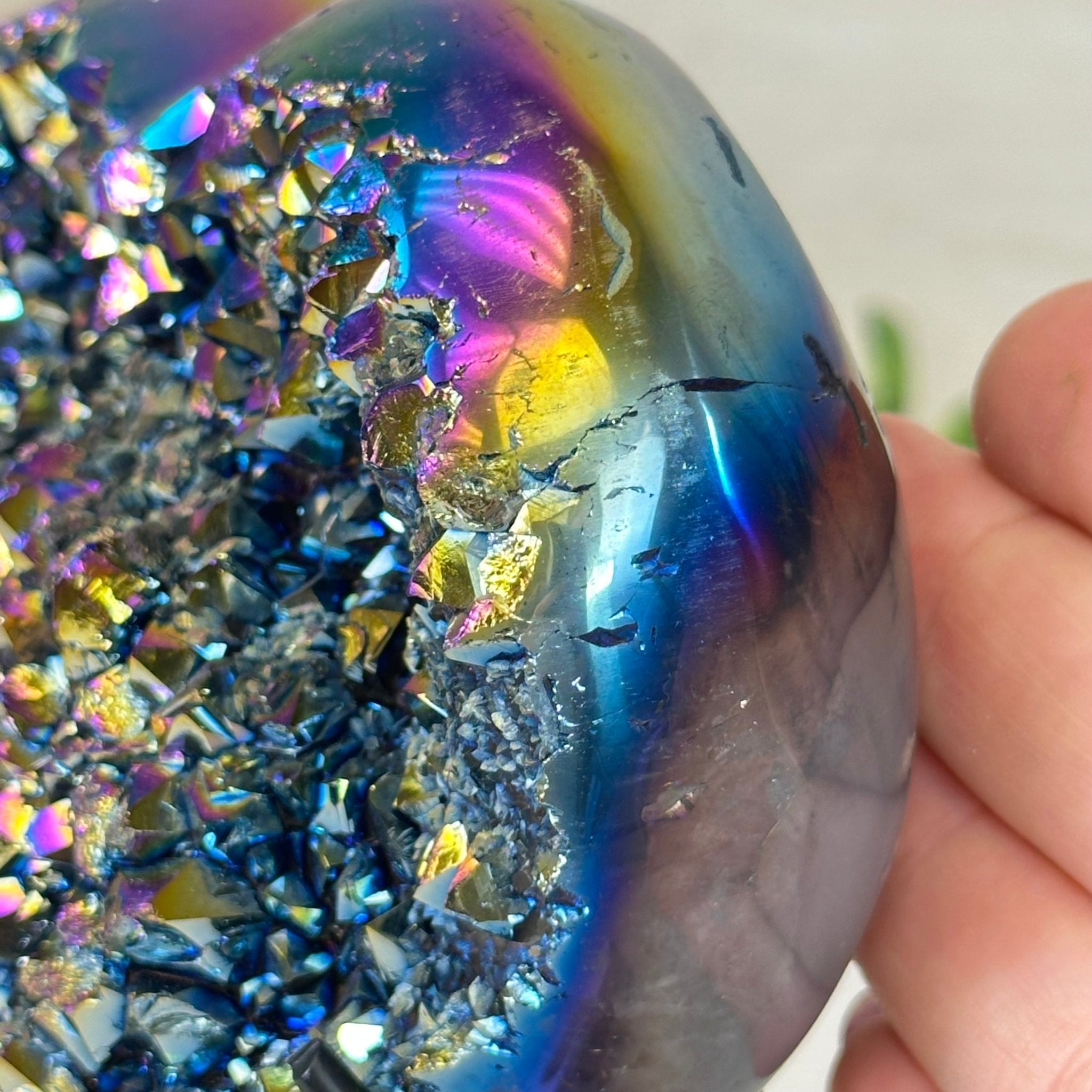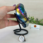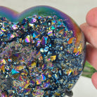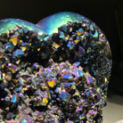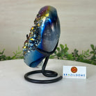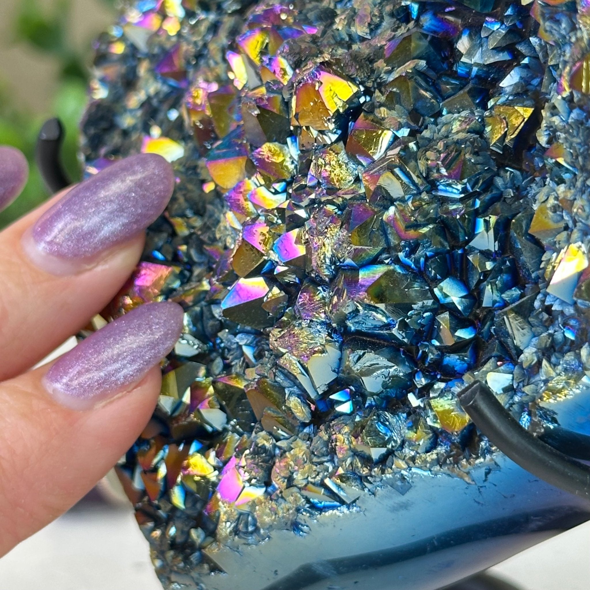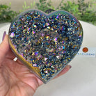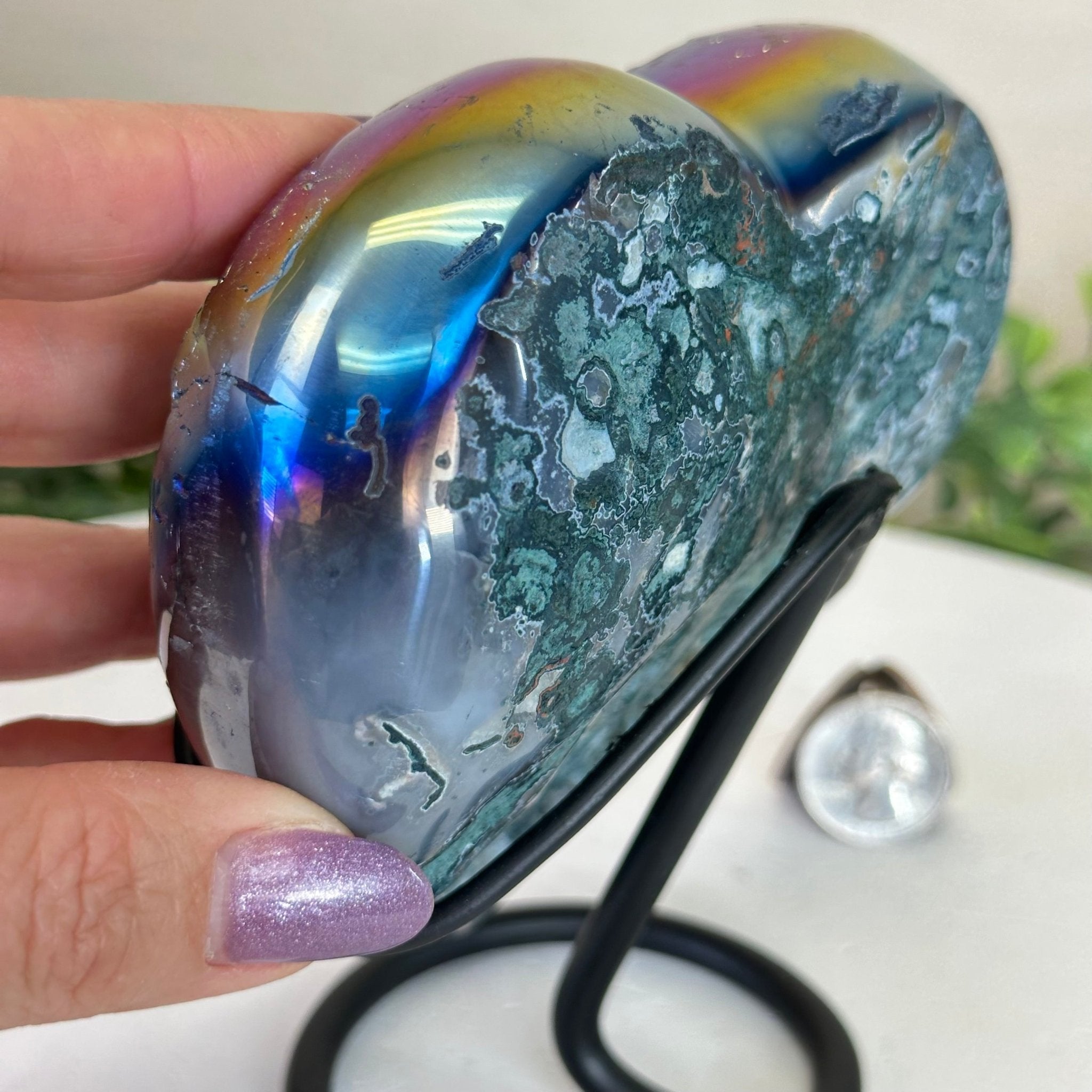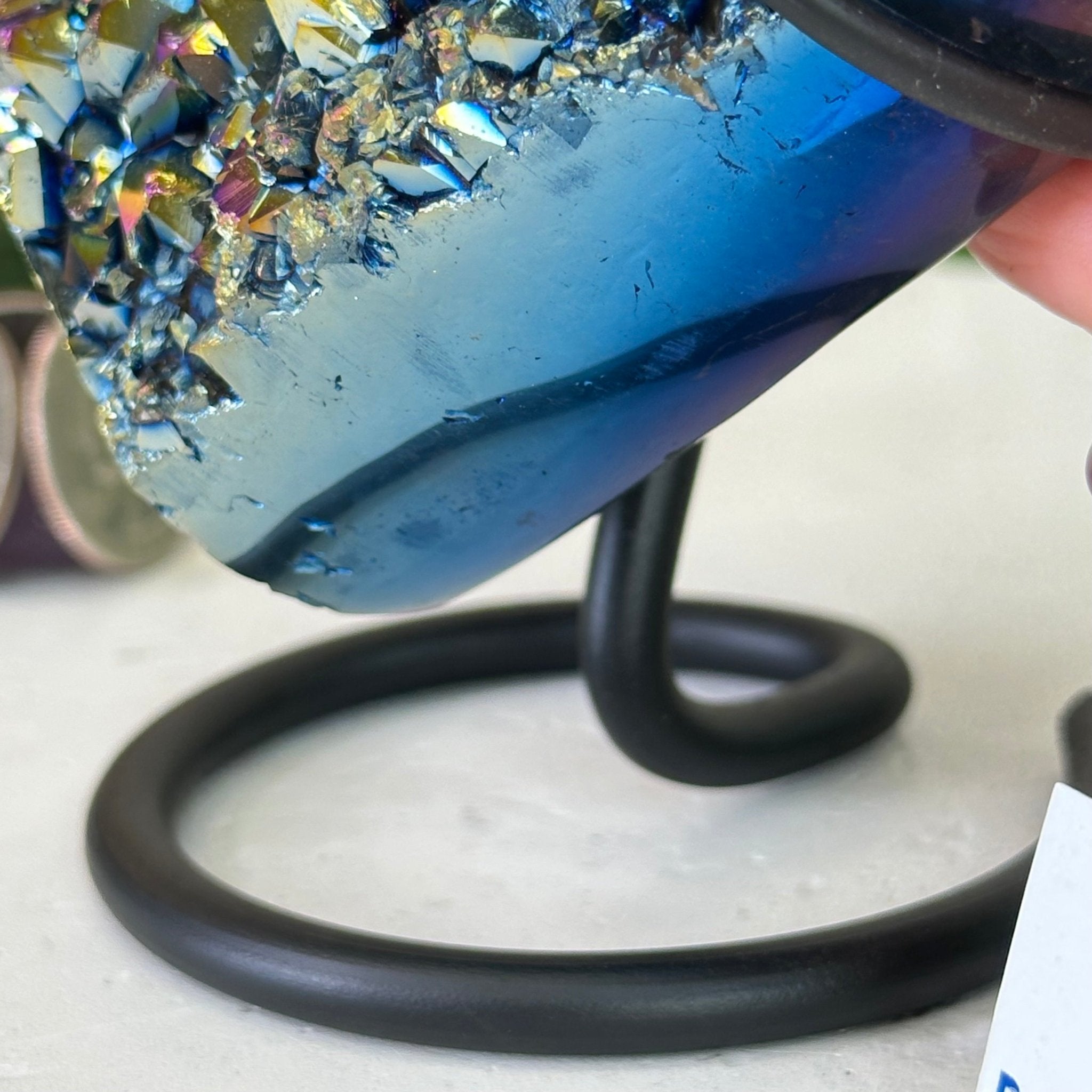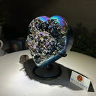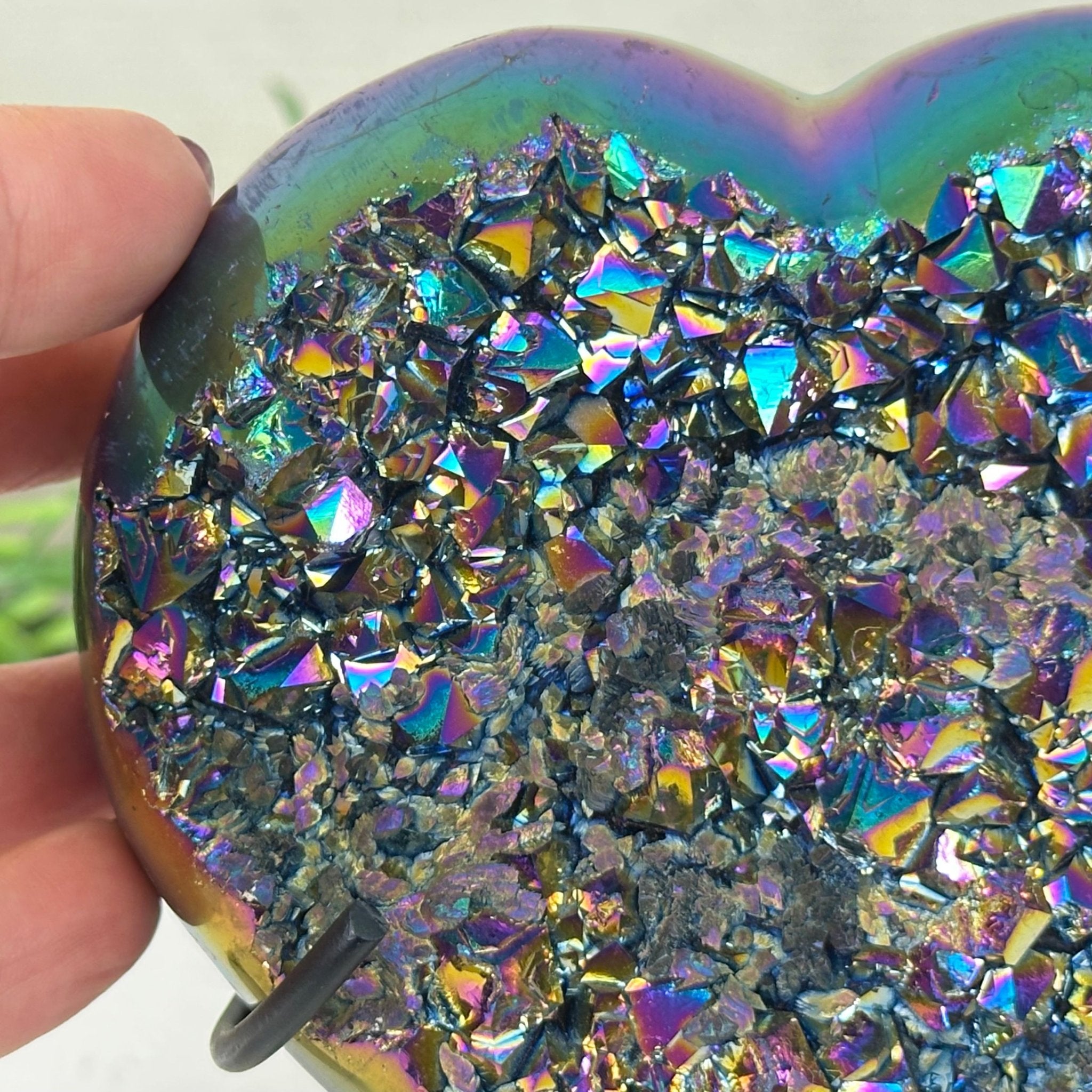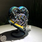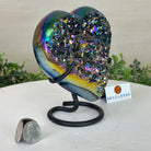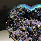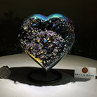 The beautiful rainbow aura effect, sometimes called titanium aura, is achieved through a process called vacuum deposition where vaporized metals such as titanium and/or niobium are bonded to the natural quartz piece in a vacuum chamber, giving it that mesmerizing iridescent metallic sheen. The result shows luminous colors that change when seen from different angles. The heart’s front showcases drusy crystals, while the back retains its raw natural shell, blending nature’s beauty with expert craftsmanship. The black metal stand ensures this mesmerizing piece is perfect for display in any home or office.