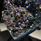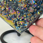 Disclaimer: This is a natural gemstone crystal sold by Brazil Gems® as is and as you see it in its images and video. It is the exact one you will receive. It may contain natural imperfections as well as imperfections, broken edges and repairs from the extraction, polishing, mounting and aura effect bonding processes. The metal stand is custom made to fit this gemstone and painted black. The rainbow aura effect is achieved through a process called vacuum deposition where vaporized metals such as titanium and/or niobium are bonded to the natural crystal in a vacuum chamber, giving it that iridescent metallic sheen. At Brazil Gems®  we make every effort to get measurements as exact as possible but they are done by human hands & eyes and therefore may have minor discrepancies.