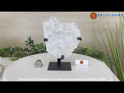 A testament to nature's sublime artistry, this extraordinary Brazilian Super Quality Clear Quartz Cluster by Brazil Gems® will boost your crystal collection to new heights. Elevated upon an elegant metal foundation, its commanding presence and radiant crystalline formations instantly captivate the observer's gaze. Each transparent facet reveals an intricate tableau of geological phenomena—a silent narrative of Earth's patient craftsmanship over countless millennia.