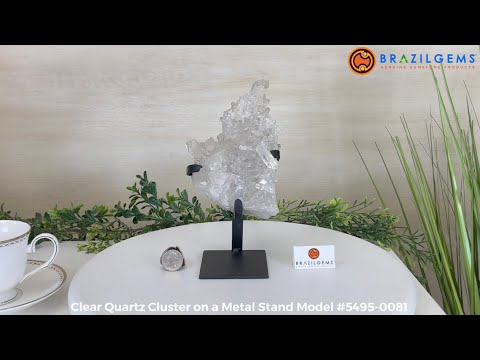 A testament to nature's sublime artistry, this extraordinary Brazilian Super Quality Clear Quartz Cluster by Brazil Gems® will boost your crystal collection to new heights. Elevated upon an elegant metal foundation, its commanding presence and radiant crystalline formations instantly captivate the observer's gaze. Each transparent facet reveals an intricate tableau of geological phenomena—a silent narrative of Earth's patient craftsmanship over countless millennia.