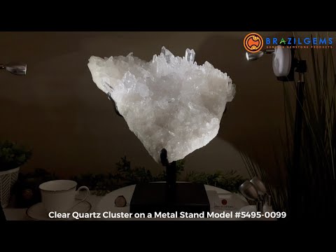 A testament to nature's sublime artistry, this extraordinary Brazilian Super Quality Clear Quartz Cluster by Brazil Gems® will boost your crystal collection to new heights. Elevated upon an elegant metal foundation, its commanding presence and radiant crystalline formations instantly captivate the observer's gaze. Each transparent facet reveals an intricate tableau of geological phenomena—a silent narrative of Earth's patient craftsmanship over countless millennia.