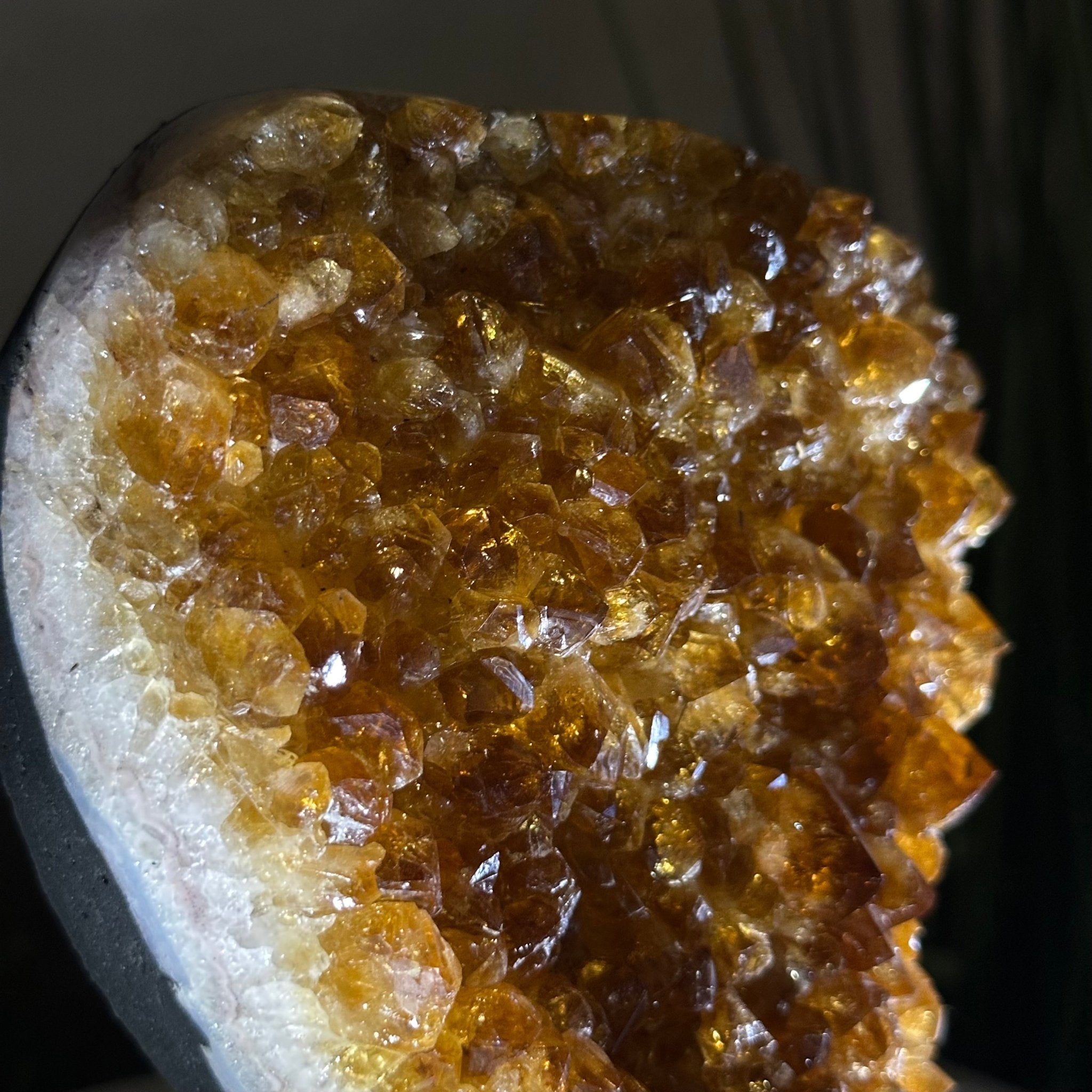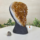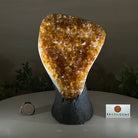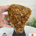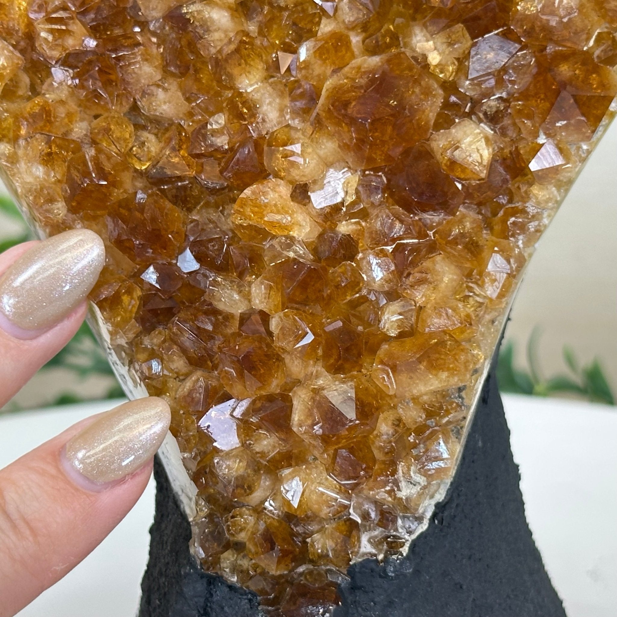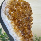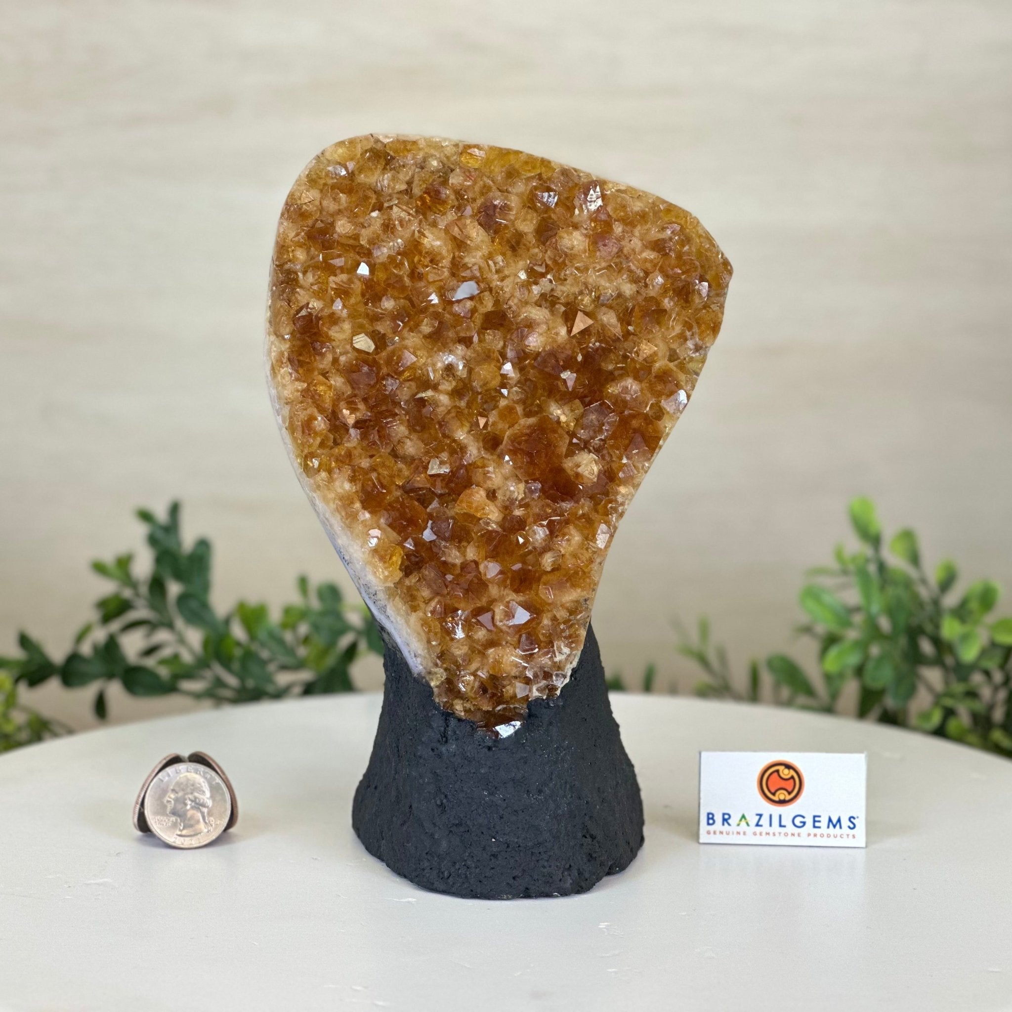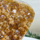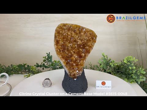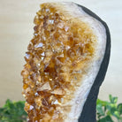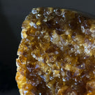 This premium Brazilian Citrine Druze Cluster by Brazil Gems® has a sturdy cement base, showcasing rich amber tones and nicely formed crystal points. A perfect piece to display in a shelf or desk.