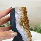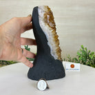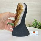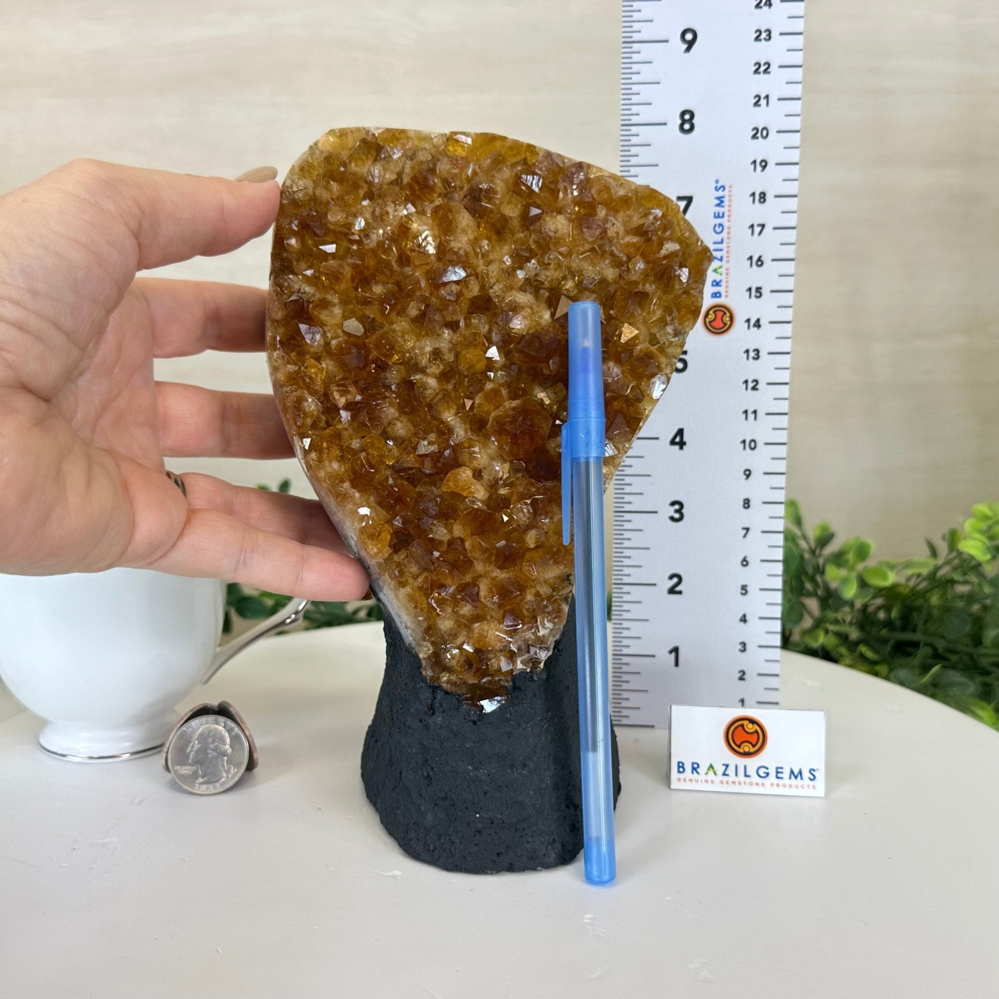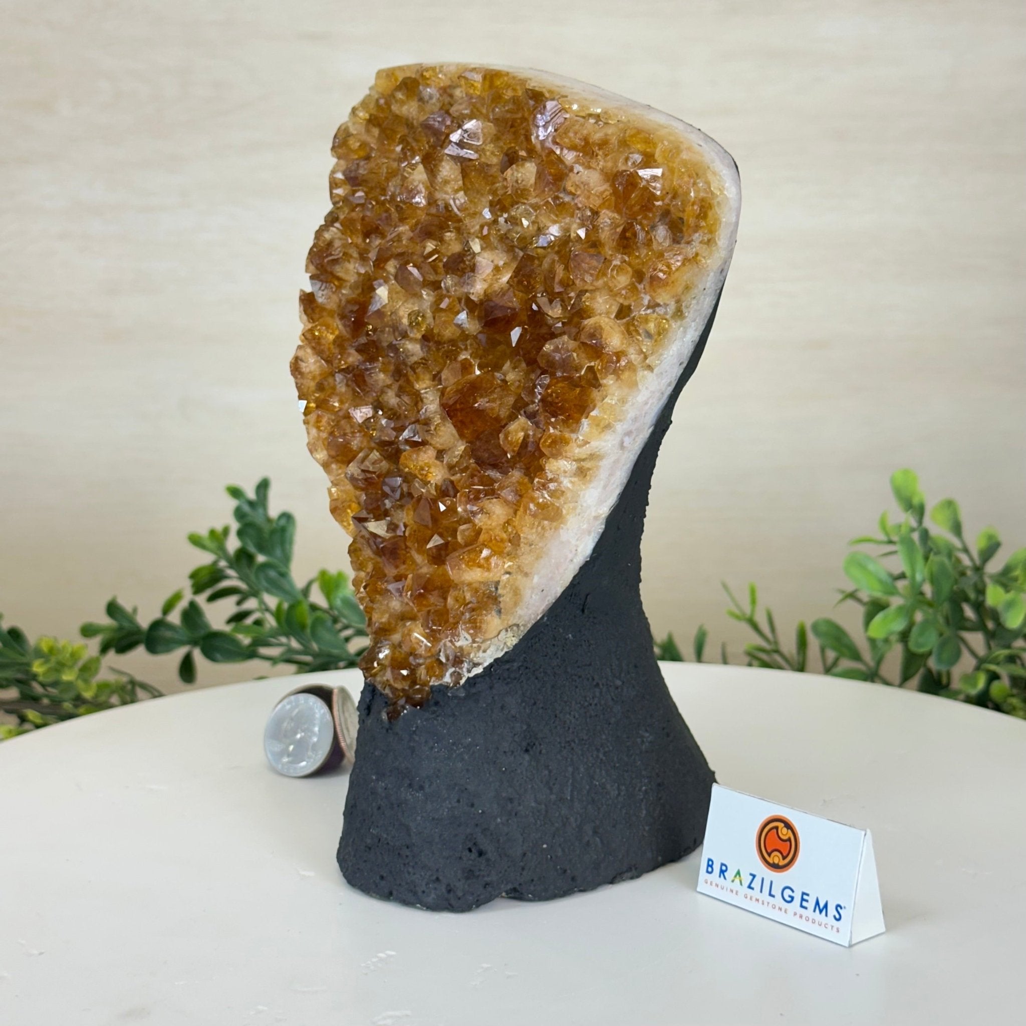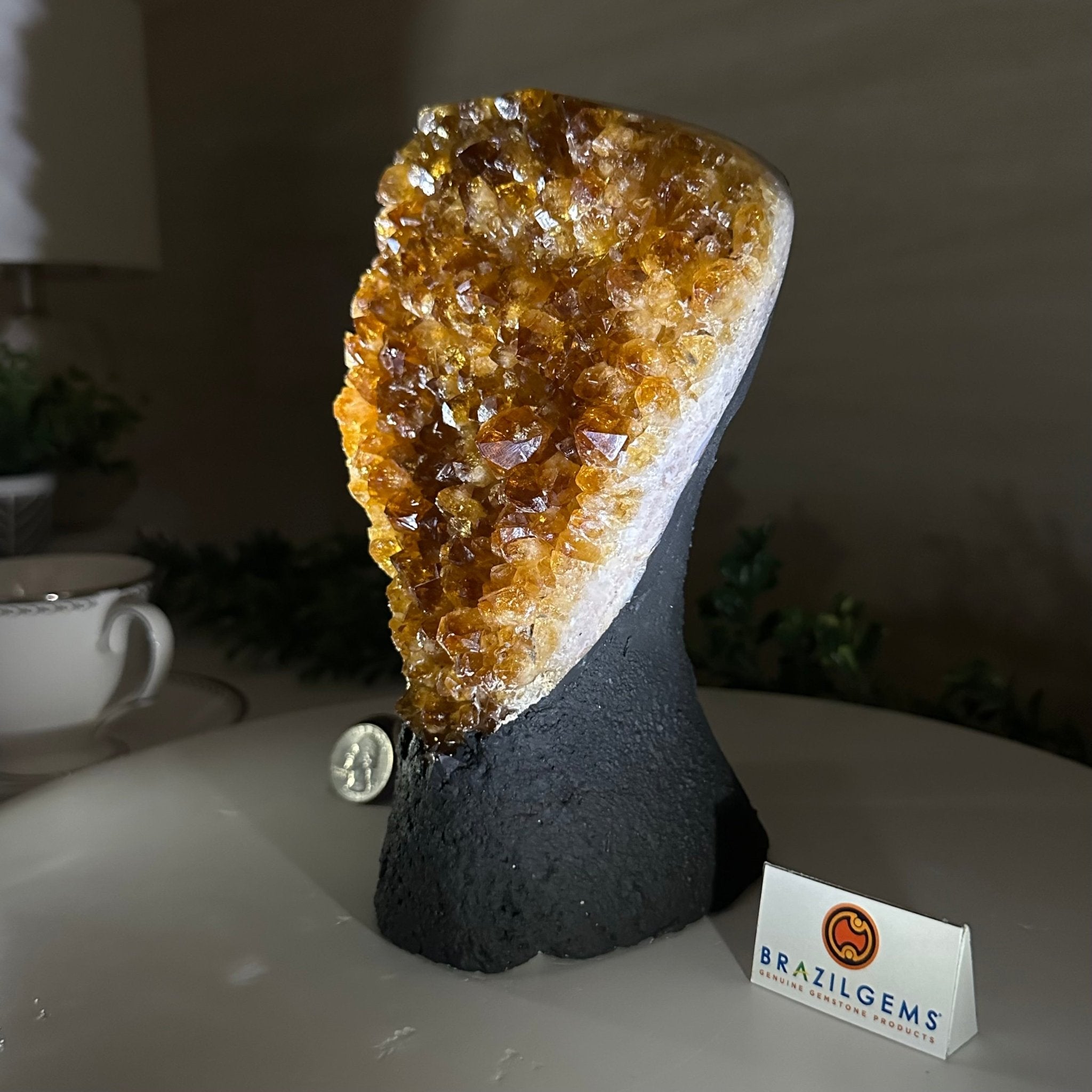 Disclaimer: This is a natural gemstone crystal sold by Brazil Gems® as is and as you see it in its images and video. It is the exact one you will receive. It may contain natural imperfections and/or imperfections, broken edges and repairs from the extraction, polishing and prepping processes. The bottom and sides have been reinforced with cement then painted black. As is the case for the majority of Citrine on the market from Brazil, this Citrine has been heated to give it its beautiful amber color. At Brazil Gems® we make every effort to get measurements as exact as possible but they are done by human hands and eyes and therefore may have minor discrepancies.