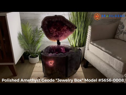 Exquisite Polished Super Quality Brazilian Amethyst Geode "Jewelry Box" with metal handle and hinge. This geode will demand attention with its polished outer shell and violet amethyst crystals.