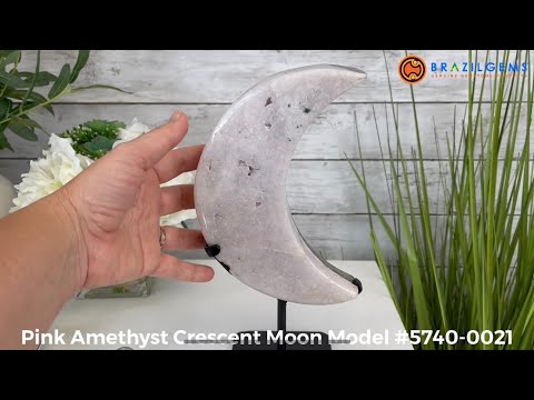 This is a Natural Polished Brazilian Pink Amethyst Crescent Moon on a metal stand. With its polished edges and natural crystals shining through you'll enjoy this piece for years to come.