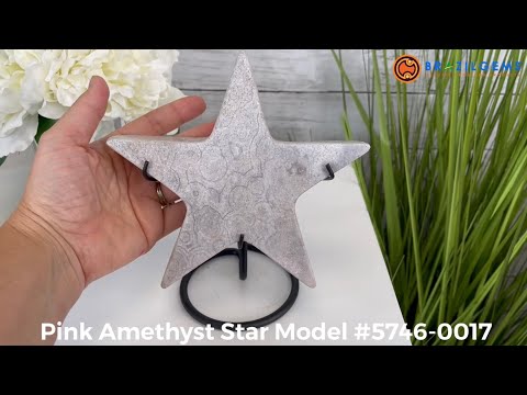 This is a Natural Polished Brazilian Pink Amethyst Star on a metal stand. With its polished edges and natural crystals shining through you'll enjoy this piece for years to come.