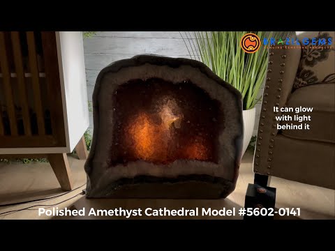 This large Extra Quality Polished Brazilian Amethyst cathedral has nicely shaped amethyst crystal points with violet colors throughout. Its wide shape fills the space accented by its beautifully natural glowing outer shell. What a deal!