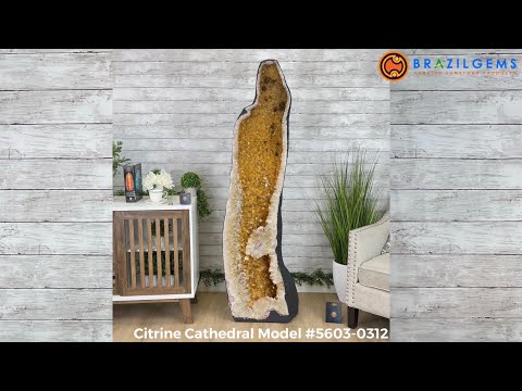 Brazil Gems® brings you the beauty and power of nature with this large Extra Quality Brazilian Citrine Cathedral. A towering piece boasting amber color crystals, mineral formations and white crystal bands all along the edges.