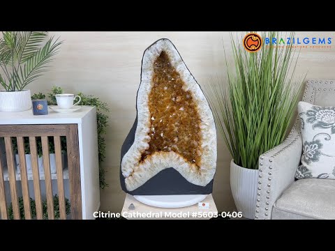 Elevate your decor game with this Extra Quality Brazilian Citrine Cathedral by Brazil Gems® . This specimen boasts bright amber color crystals and a polished white crystals band along the edges.
