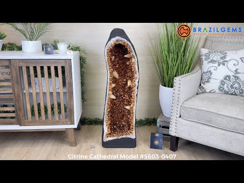 Elevate your decor game with this Super Quality Brazilian Citrine Cathedral by Brazil Gems® . This specimen boasts darker amber color crystals naturally adorned with calcite formations, which add character to this unique piece.