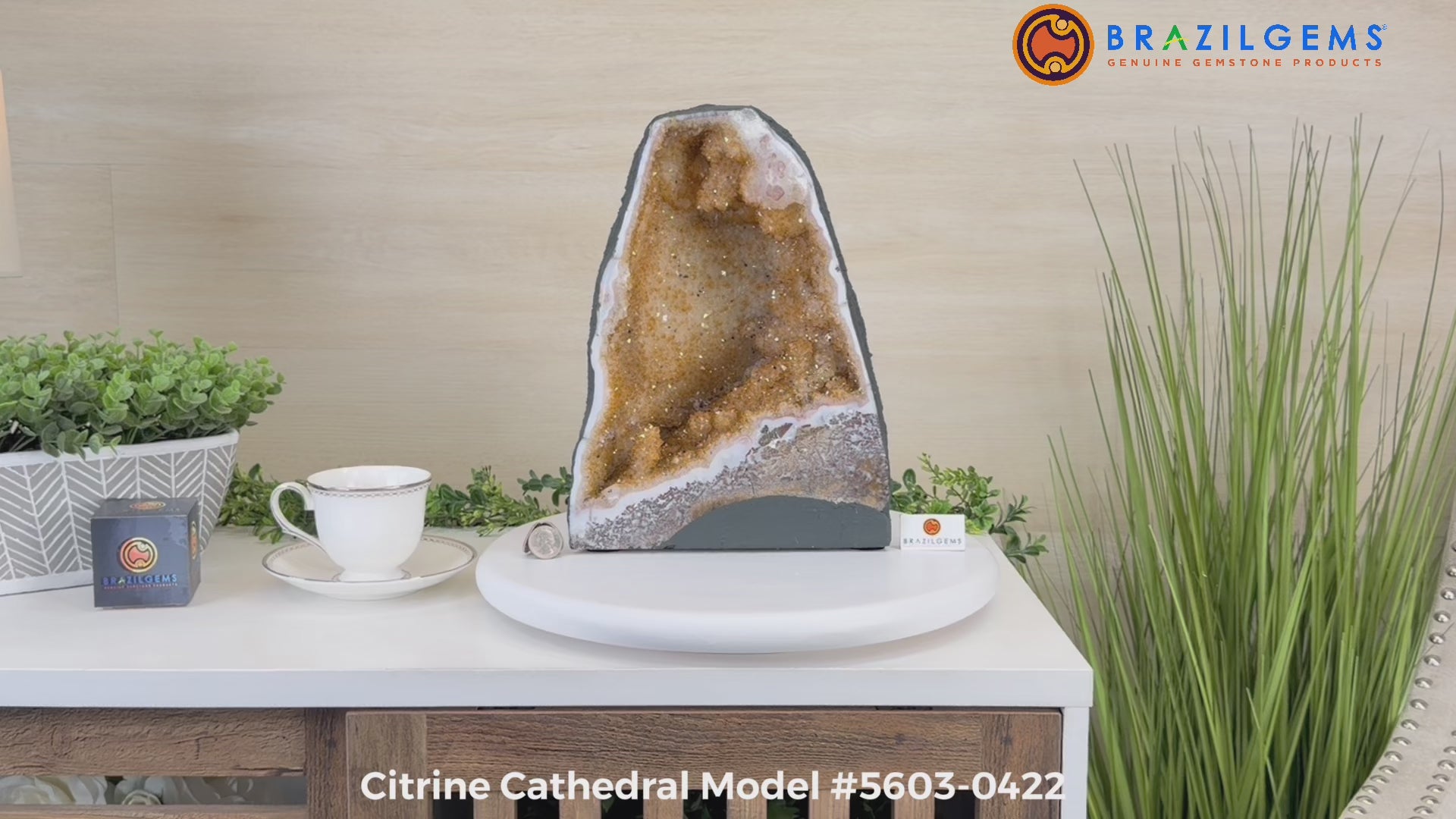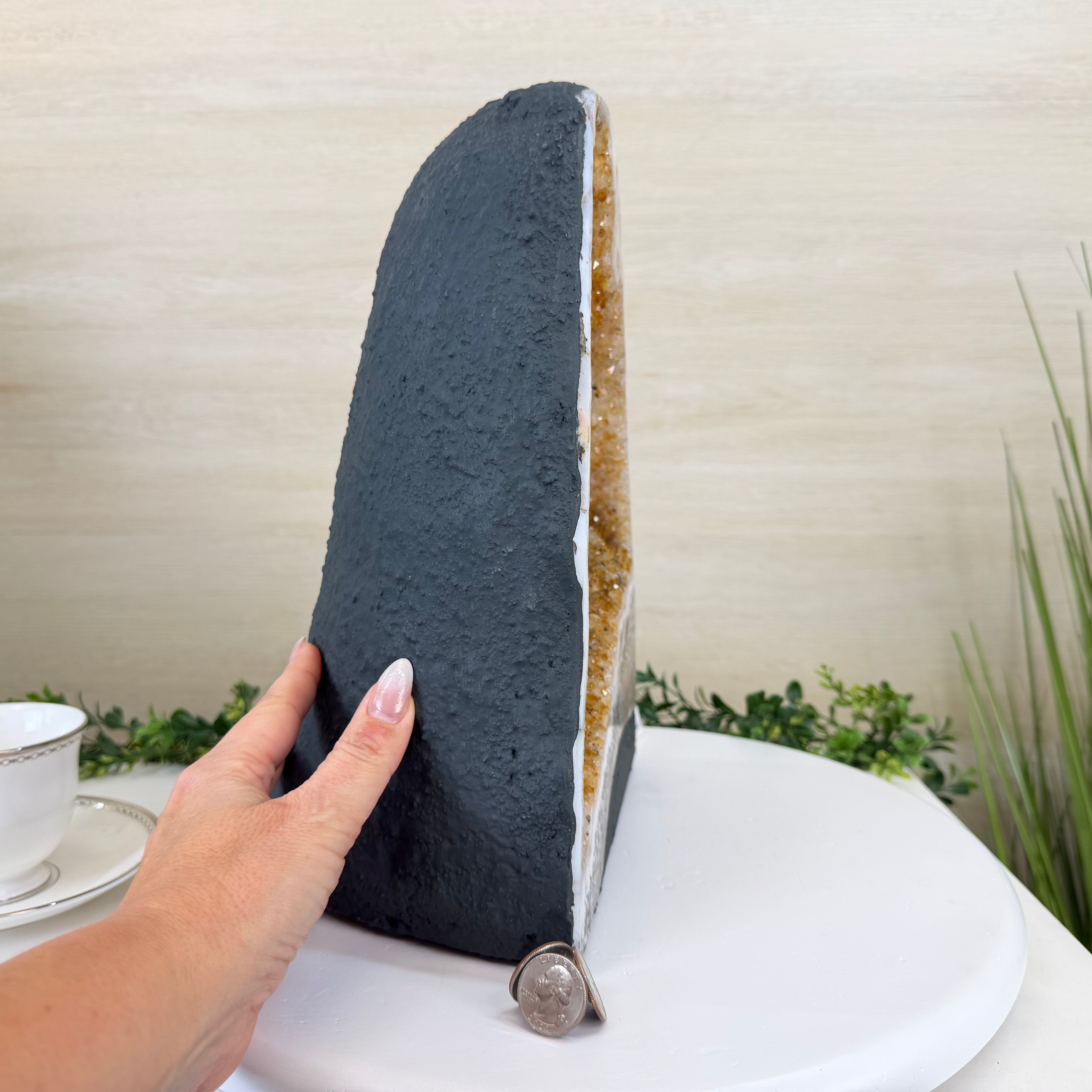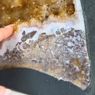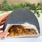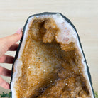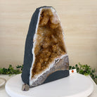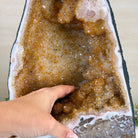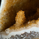 This impressive Extra Quality Brazilian Citrine Cathedral Geode, features radiant golden-amber crystals will enhance your favorite space. This geode displays sparkling citrine points and distinctive white crystal bands along the outer edges, creating a dramatic natural contrast.