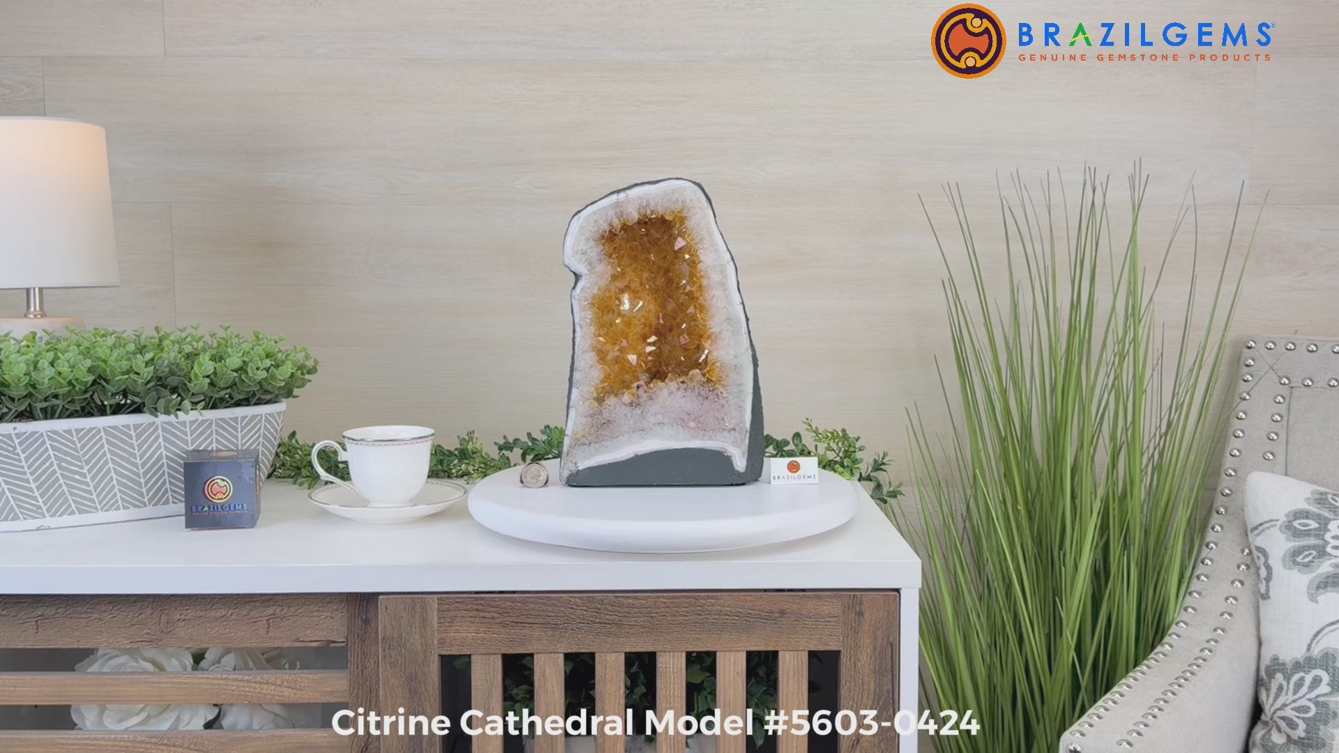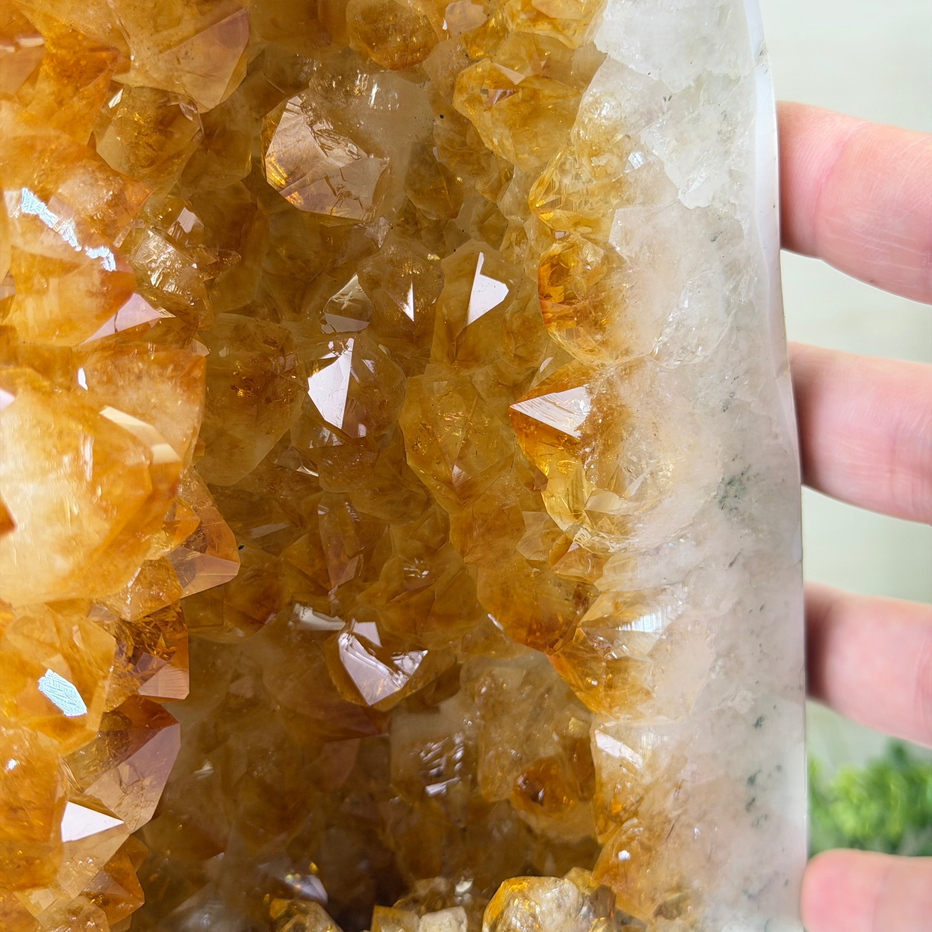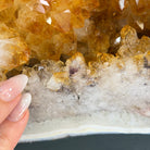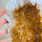 This impressive Extra Quality Brazilian Citrine Cathedral Geode, features radiant golden-amber crystals will enhance your favorite space. This geode displays sparkling citrine points and distinctive white crystal bands along the outer edges, creating a dramatic natural contrast.