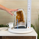This is a natural gemstone crystal sold by Brazil Gems® as is and as you see it in its images and video. It is the exact one you will receive. It may contain natural imperfections and/or imperfections, broken edges and repairs from the extraction, cutting, polishing and prepping processes. In order for it to stand on its own, the back and bottom have been reinforced with a small amount of cement then painted black.  As is the case for the majority of Citrine on the market from Brazil, this Citrine has been heated to give it its beautiful amber color. At Brazil Gems® we make every effort to get measurements as exact as possible but they are done by human hands and eyes and therefore may have minor discrepancies.