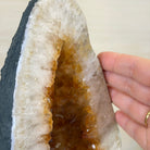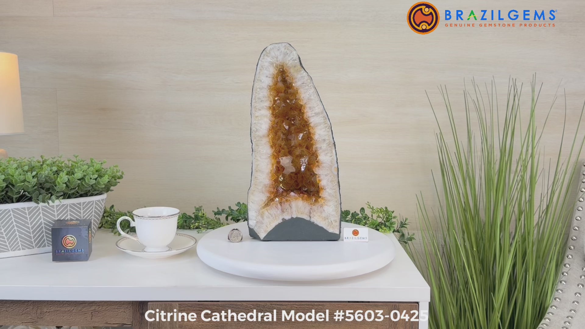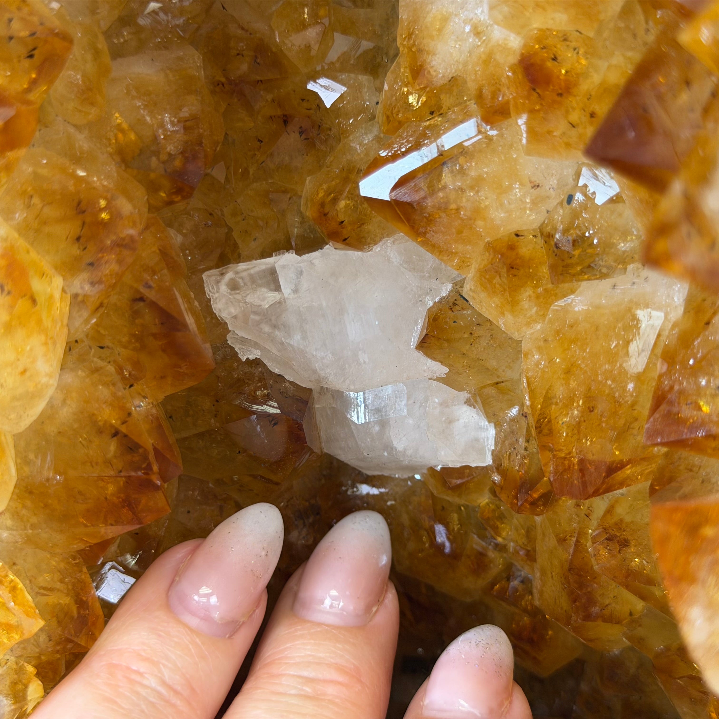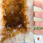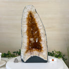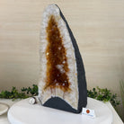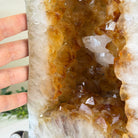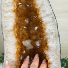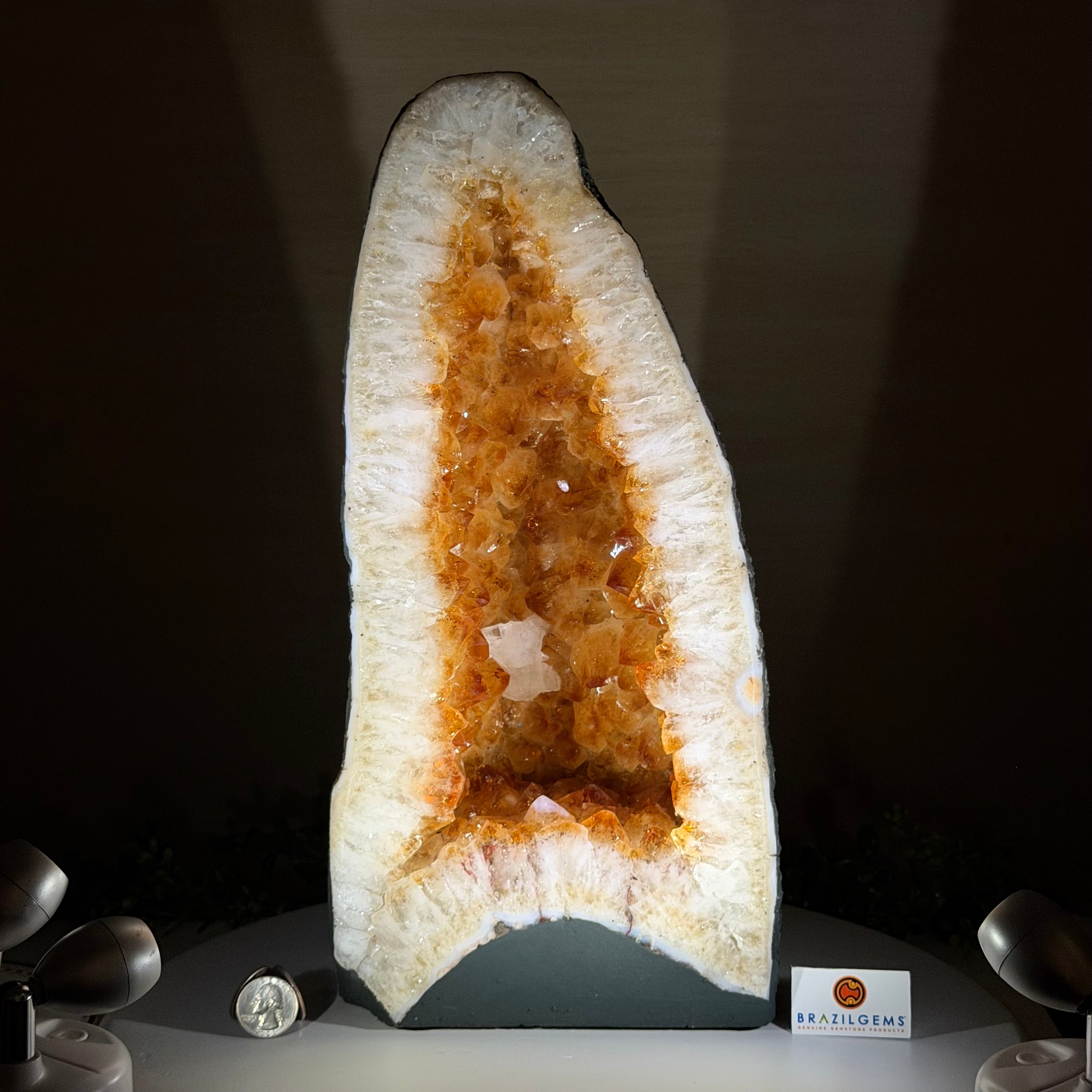 This impressive Extra Plus Quality Brazilian Citrine Cathedral Geode, features radiant golden-amber crystals will enhance your favorite space. This geode displays sparkling citrine points and distinctive white crystal bands along the outer edges, creating a dramatic natural contrast.