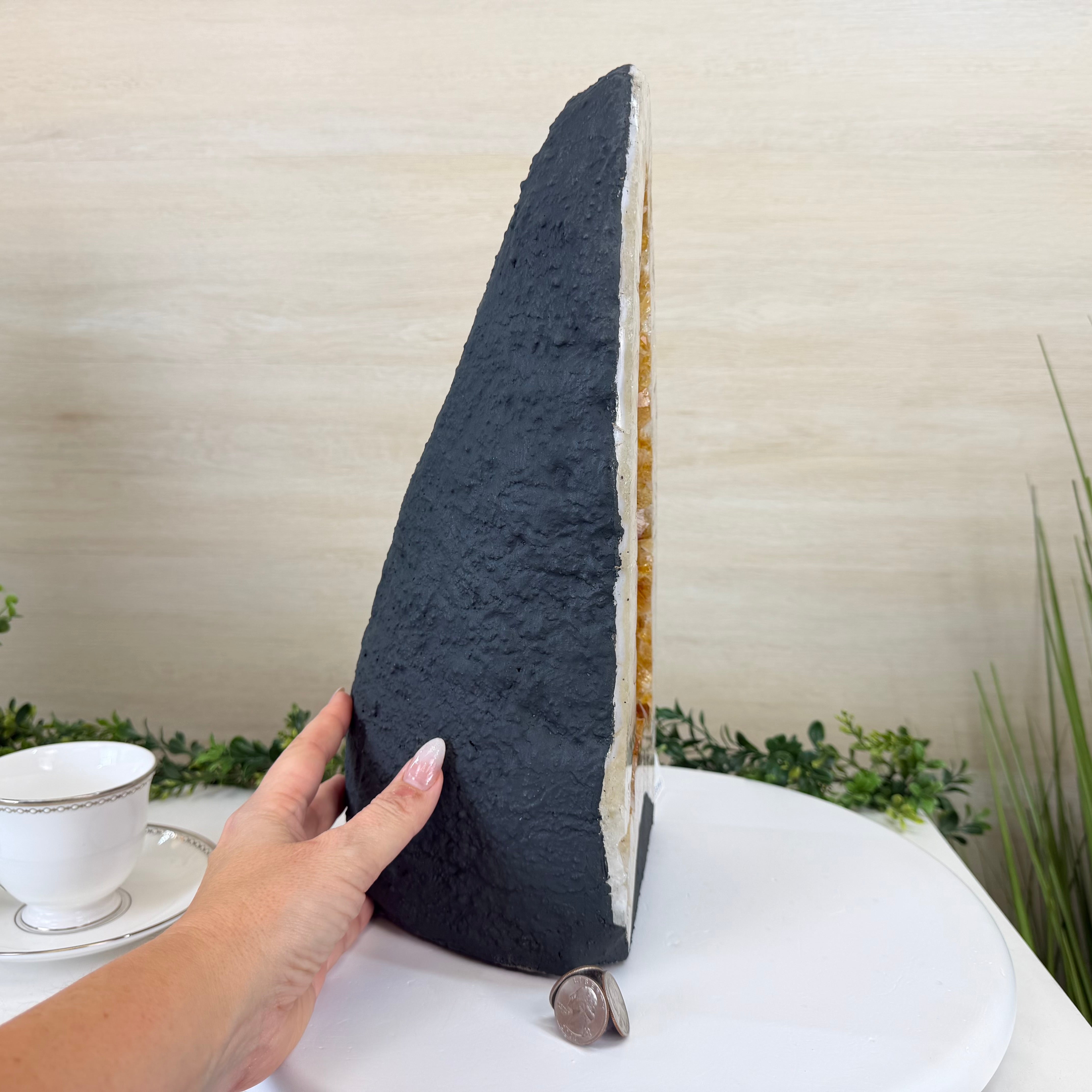 This striking citrine cathedral has been carefully heat-treated from natural Brazilian amethyst, a traditional process that brings out the warm golden citrine color while preserving the natural crystal structure of the geode. Standing tall and full of brilliant crystal points, this piece makes a stunning display specimen for collectors and crystal enthusiasts or simply as a beautiful home decor.