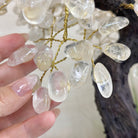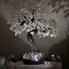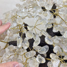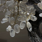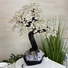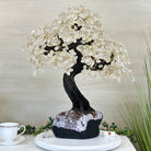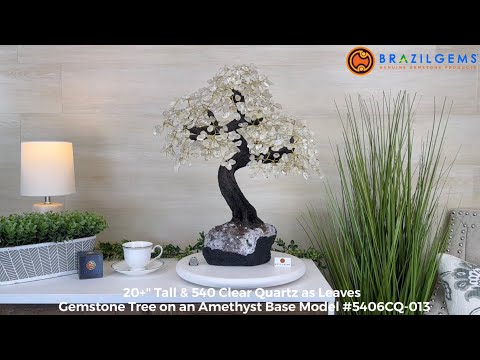 Nature and Artistry combine to create this Large Handmade Gemstone Tree with Clear Quartz Gemstones as leaves. Set atop a large Amethyst cluster base, it has a masterfully detailed trunk and branches crafted from resin in a bonsai tree style and 108 wired branches supporting 540 tumbled gemstones.