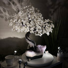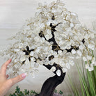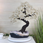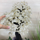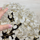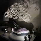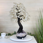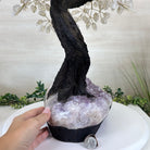Nature and Artistry combine to create this Large Handmade Gemstone Tree with Clear Quartz Gemstones as leaves. Set atop a large Amethyst cluster base, it has a masterfully detailed trunk and branches crafted from resin in a bonsai tree style and 108 wired branches supporting 540 tumbled gemstones.
