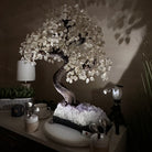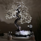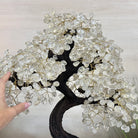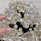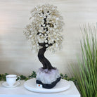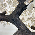 Nature and Artistry combine to create this Large Handmade Gemstone Tree with Clear Quartz Gemstones as leaves. Set atop a large Amethyst cluster base, it has a masterfully detailed trunk and branches crafted from resin in a bonsai tree style and 144 wired branches supporting 720 tumbled gemstones.