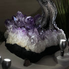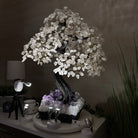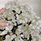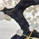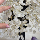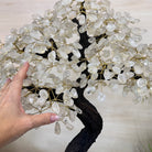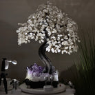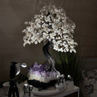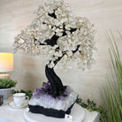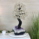 Nature and Artistry combine to create this Large Handmade Gemstone Tree with Clear Quartz Gemstones as leaves. Set atop a large Amethyst cluster base, it has a masterfully detailed trunk and branches crafted from resin in a bonsai tree style and 144 wired branches supporting 720 tumbled gemstones.