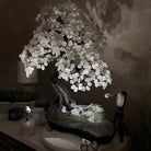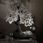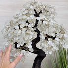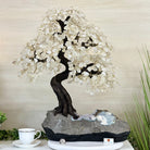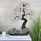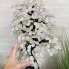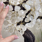 Nature and Artistry combine to create this Large Handmade Gemstone Tree with Clear Quartz Gemstones as leaves. Set atop a large Amethyst cluster base, it has a masterfully detailed trunk and branches crafted from resin in a bonsai tree style and 144 wired branches supporting 720 tumbled gemstones.