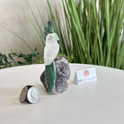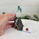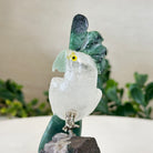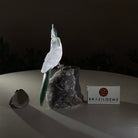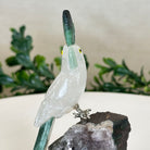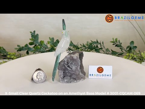 Marvel at our exquisite hand-carved X-Small Size Cockatoo gemstone bird perched on a captivating Amethyst cluster base, a harmonious blend of nature, art, and elegance. Crafted from premium Clear Quartz for its body, Green Quartz for its beak, Green Quartz for its crest and its tail and adorned with cute little metal feet, this stunning sculpture captures the essence of nature's beauty.
