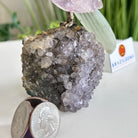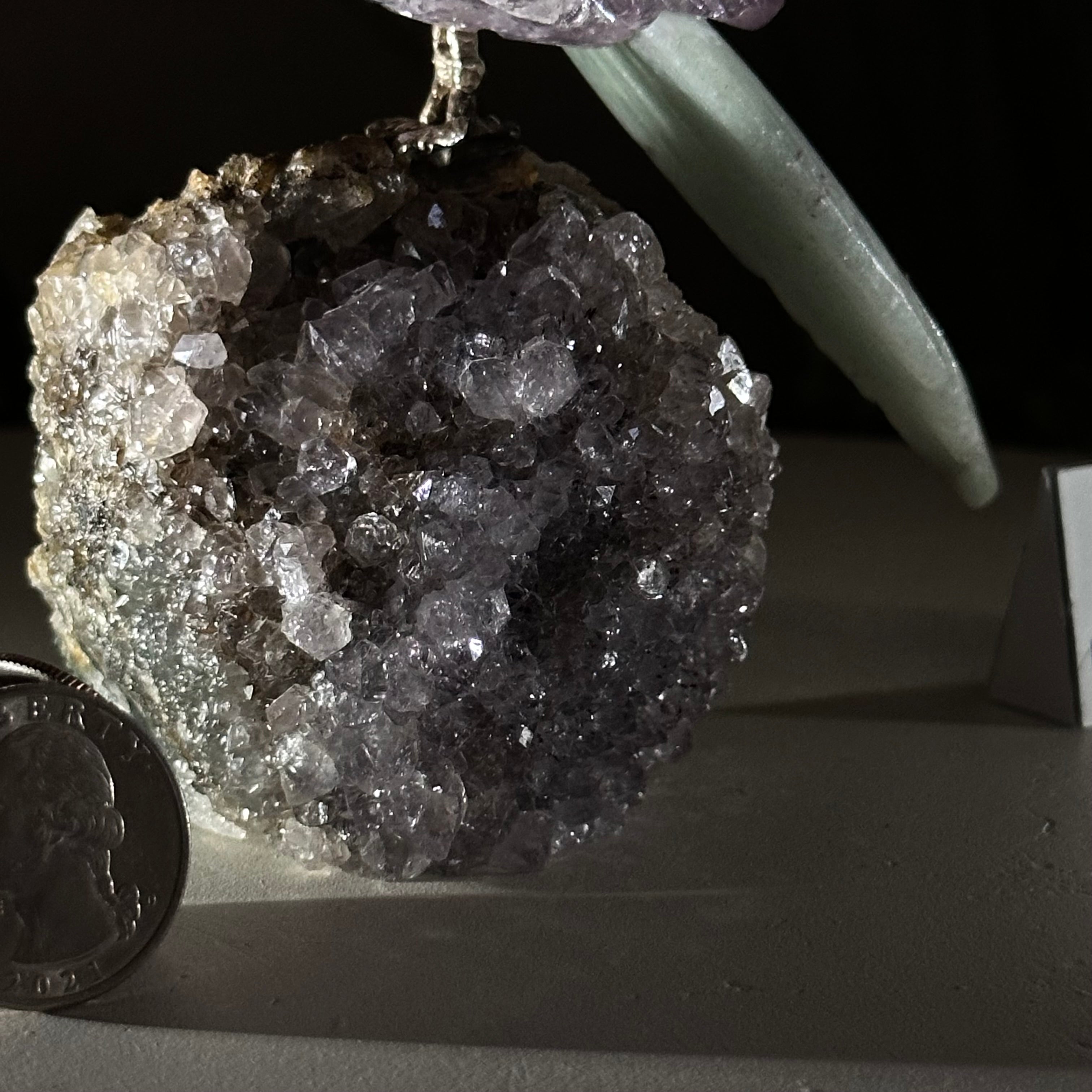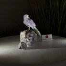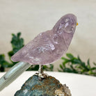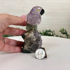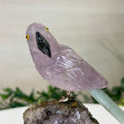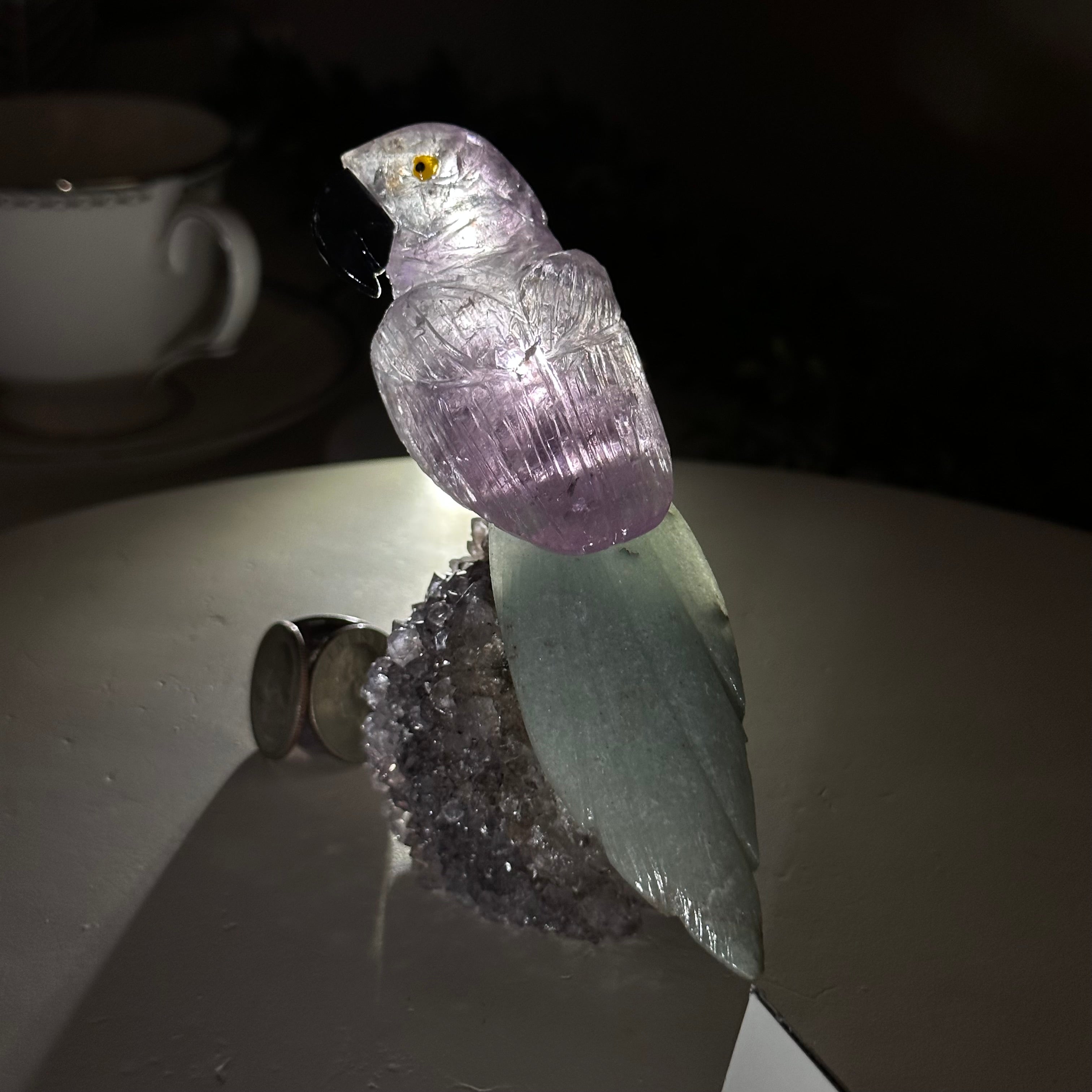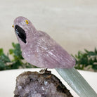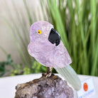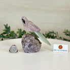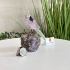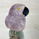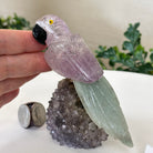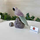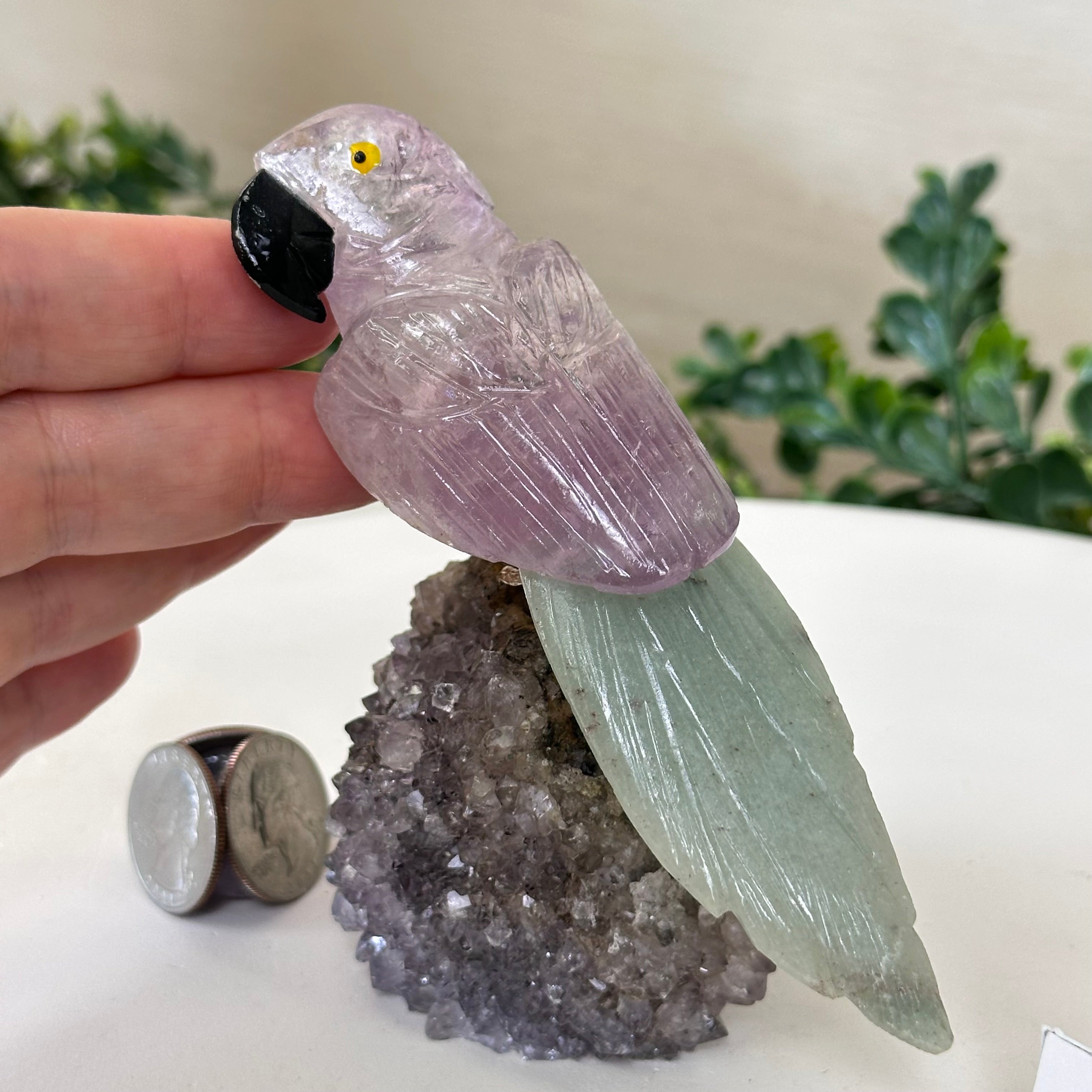 Marvel at our exquisite hand-carved Small Size Parrot crystal bird perched on a captivating Amethyst cluster base, a harmonious blend of nature, art, and elegance. Crafted from premium Amethyst for its body, Black Onyx for its beak, Green Quartz for its tail and adorned with cute little metal feet, this stunning sculpture captures the essence of nature's beauty.
