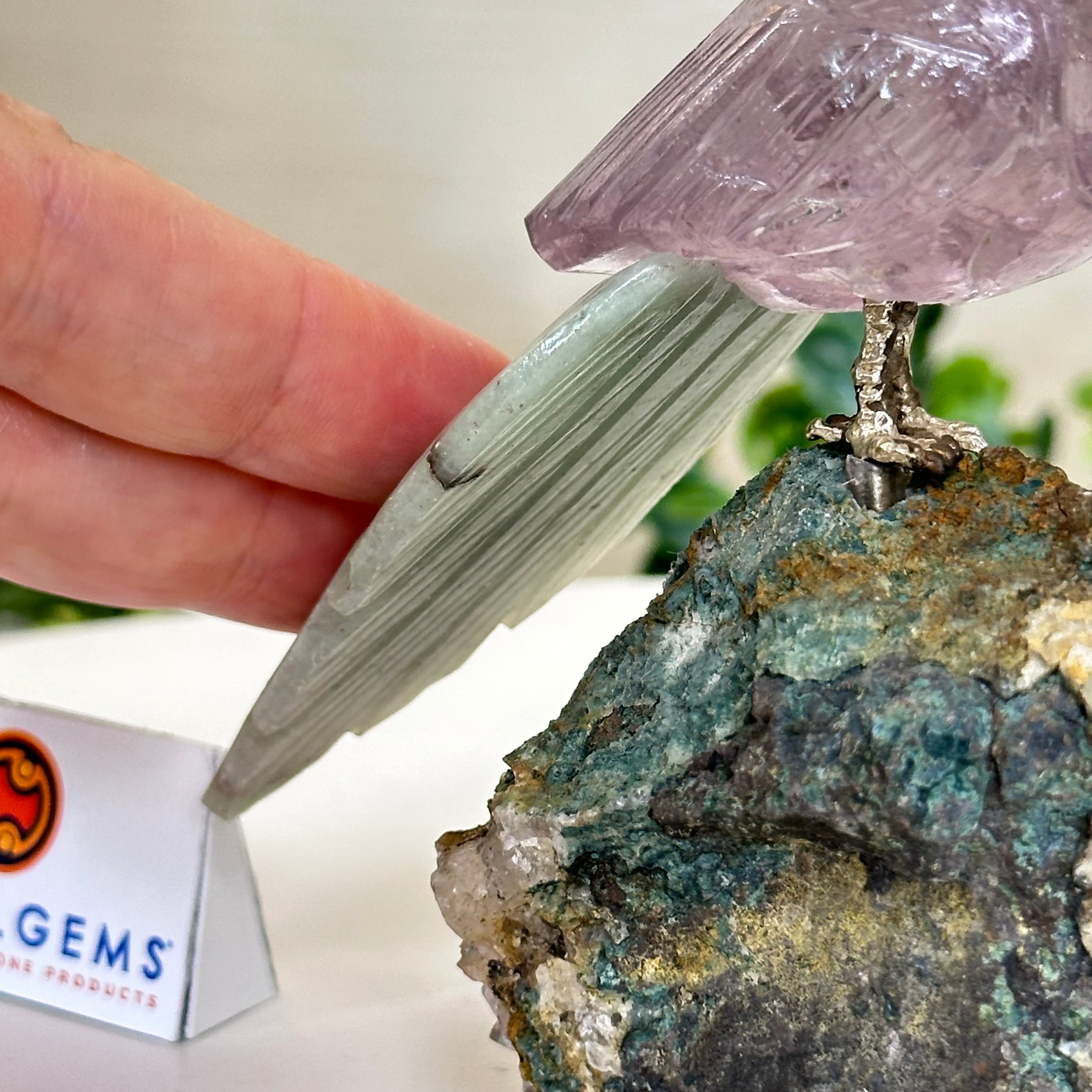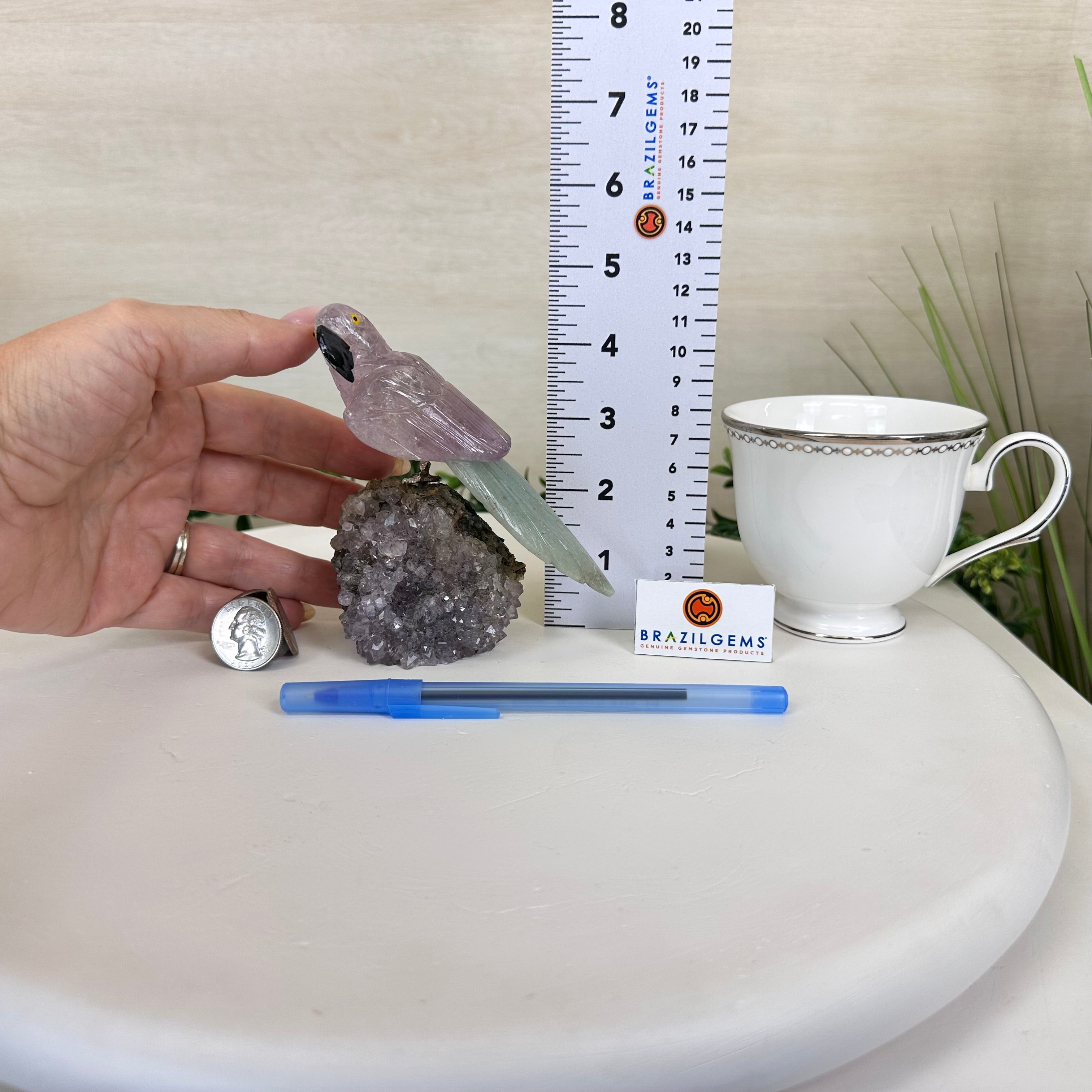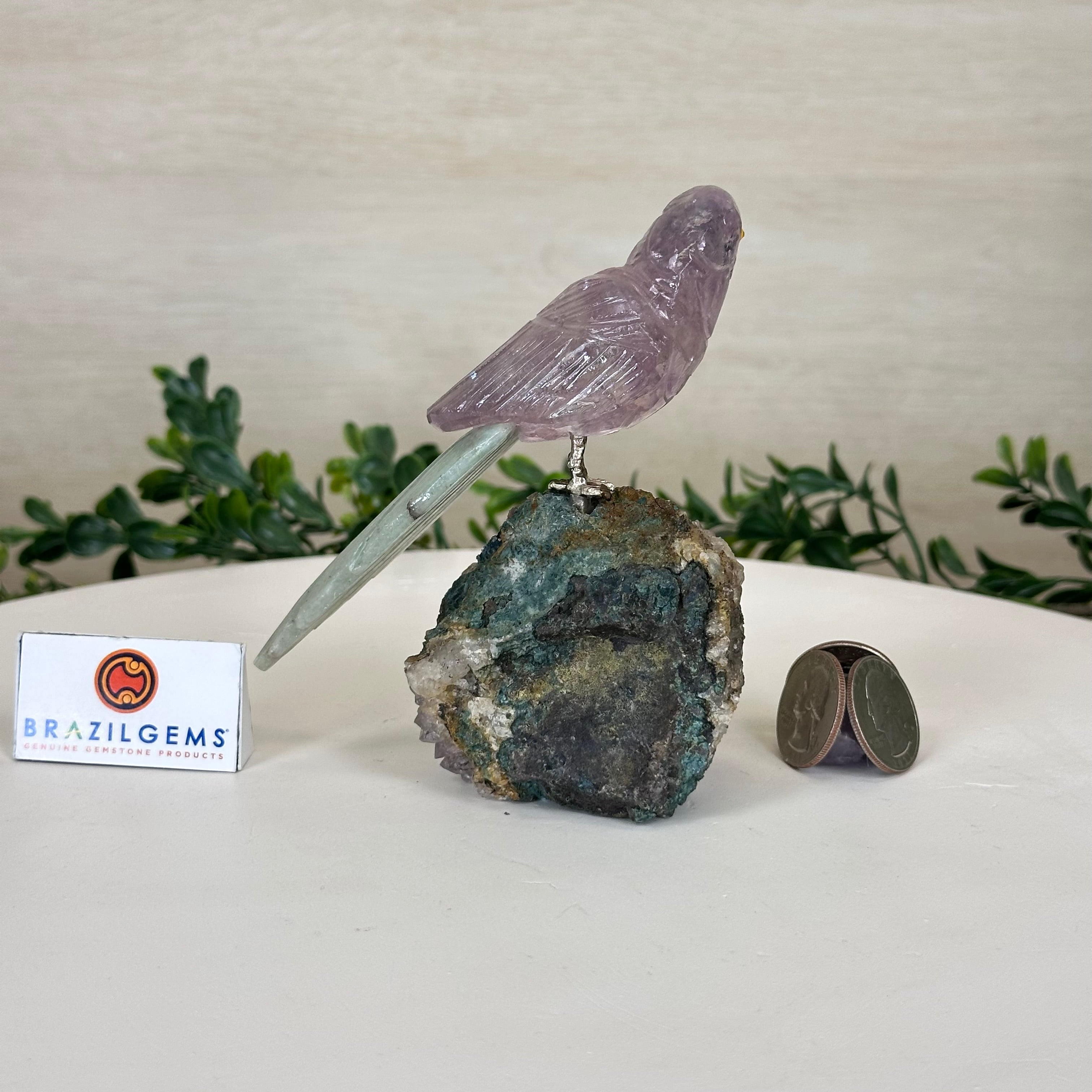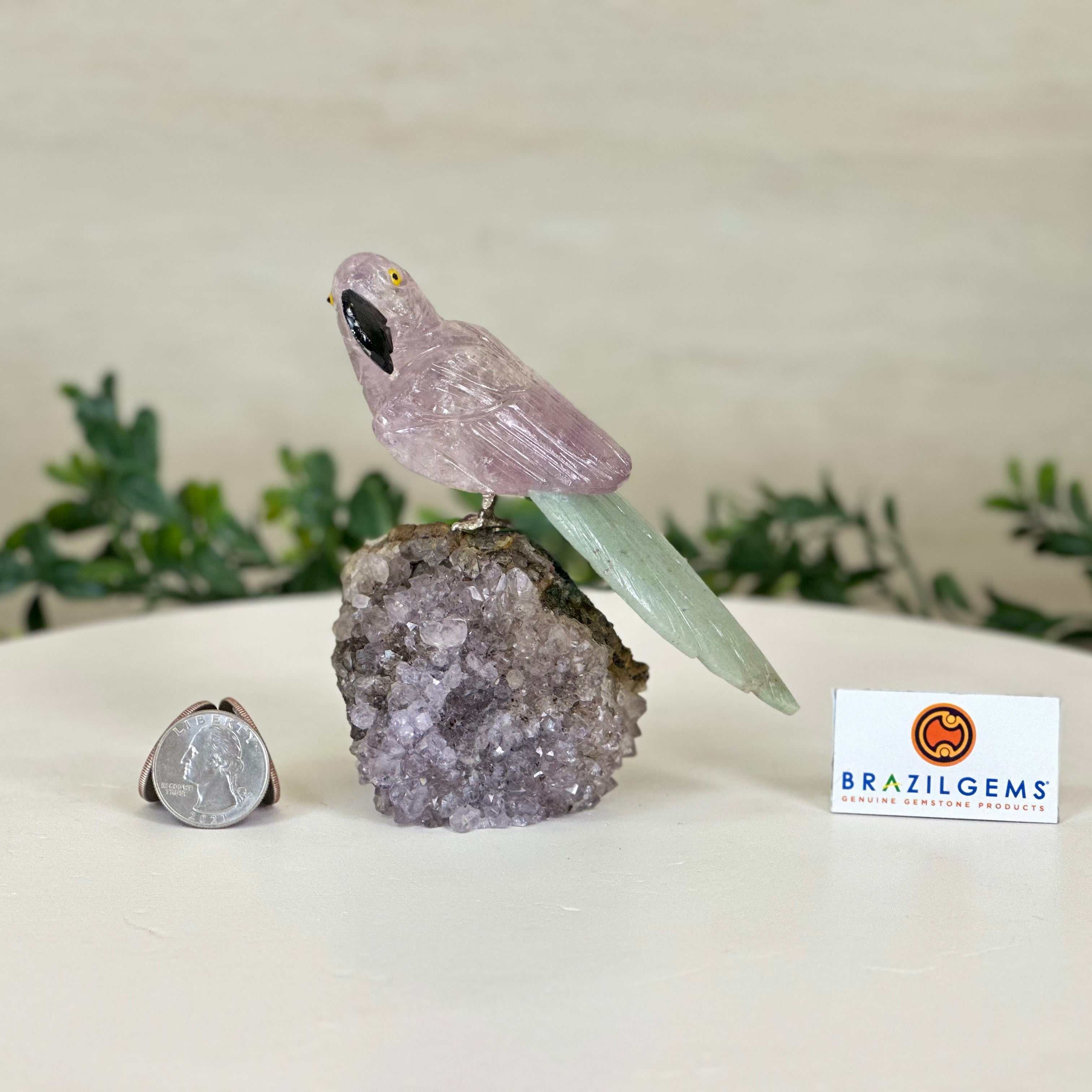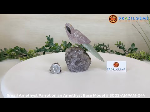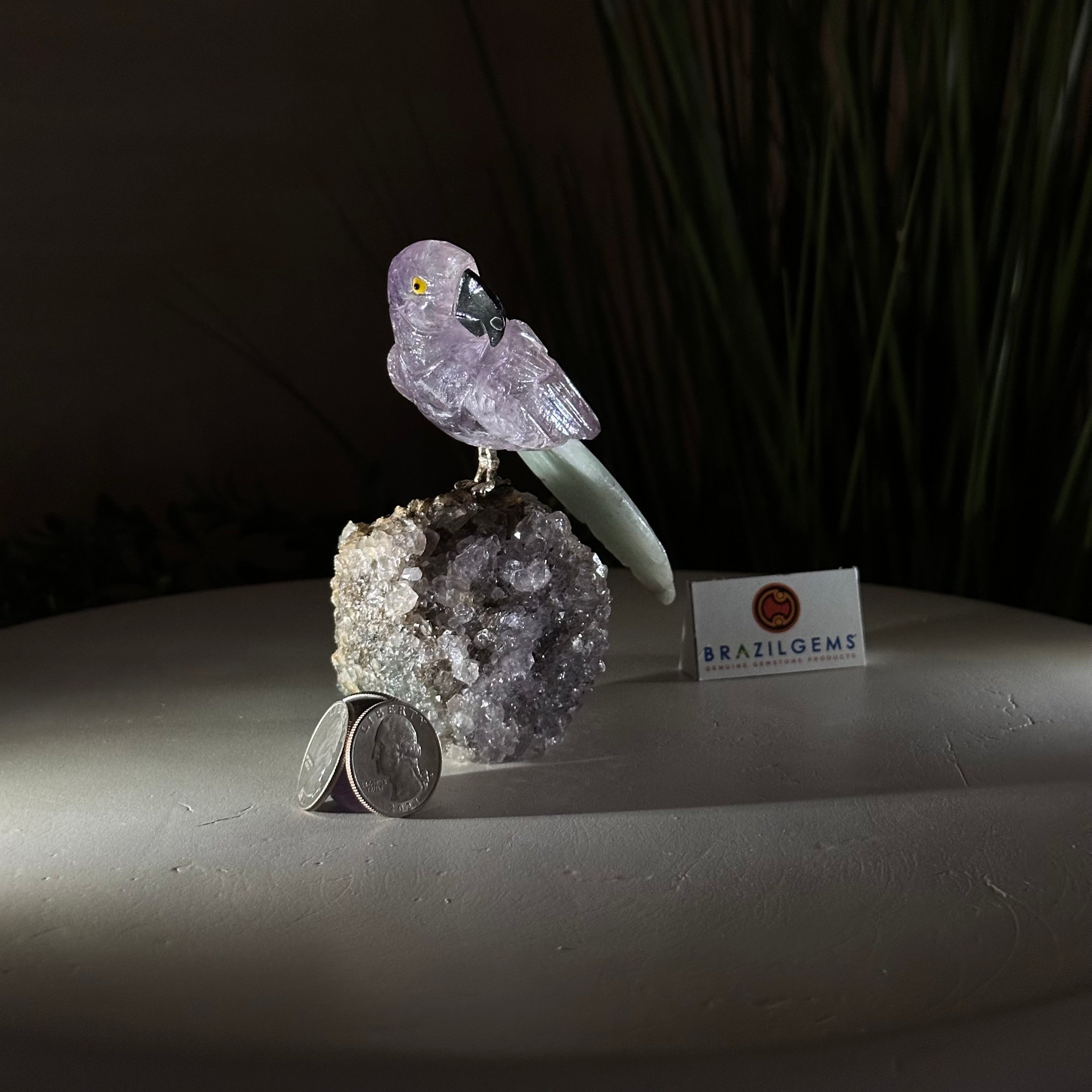 Each intricate detail of the bird is meticulously carved by skilled Brazilian artisans who have mastered the technique that combines the beauty of Brazil's gemstones with their colorful native birds into an amazing art piece. Elevate your space with the timeless charm of our Parrot gemstone bird on an Amethyst base.