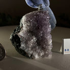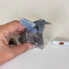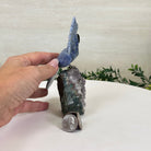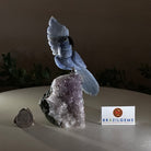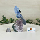 Marvel at our exquisite hand-carved Small Size Cockatoo crystal bird perched on a captivating Amethyst cluster base, a harmonious blend of nature, art, and elegance. Crafted from premium Blue Quartz for its body, Black Onyx for its beak, Blue Quartz for its crest and its tail and adorned with cute little metal feet, this stunning sculpture captures the essence of nature's beauty.