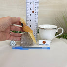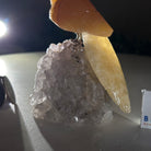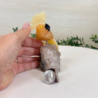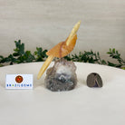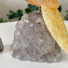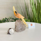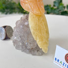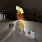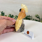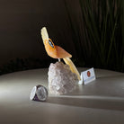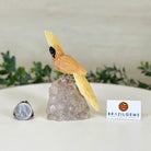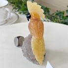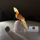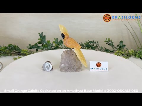 Marvel at our exquisite hand-carved Small Size Cockatoo crystal bird perched on a captivating Amethyst cluster base, a harmonious blend of nature, art, and elegance. Crafted from premium Orange Calcite for its body, Black Onyx for its beak, Orange Calcite for its crest, Blue Quartz for its tail and adorned with cute little metal feet, this stunning sculpture captures the essence of nature's beauty.