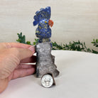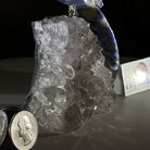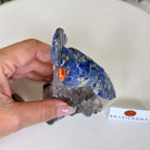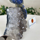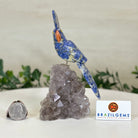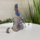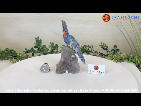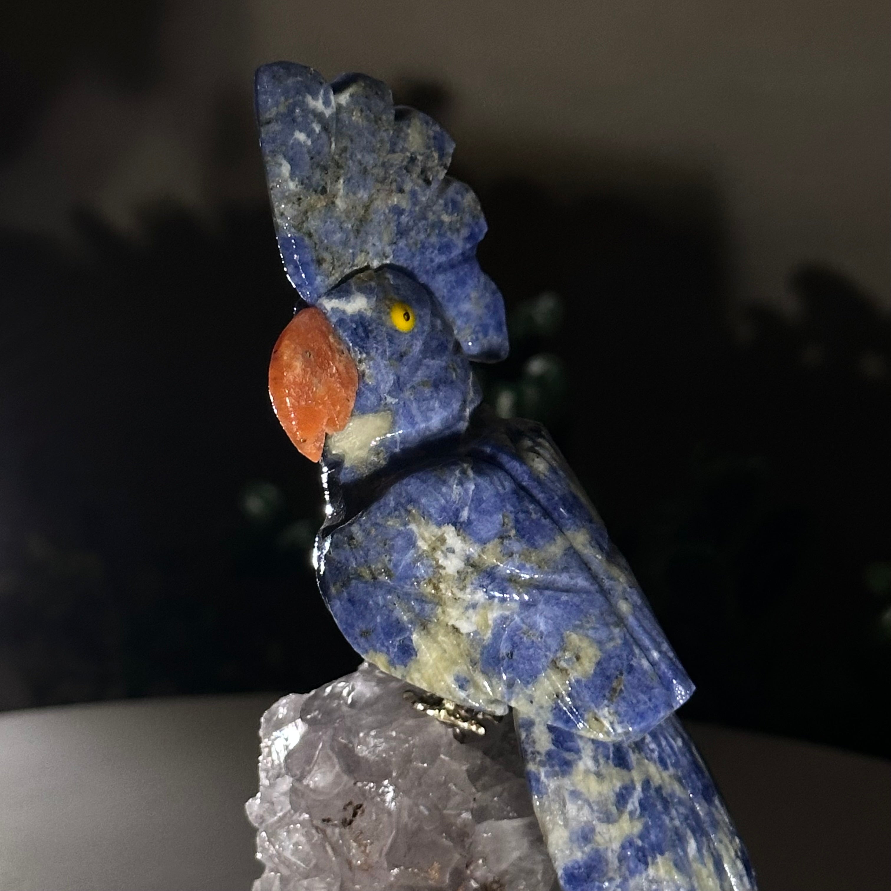 Marvel at our exquisite hand-carved Small Size Cockatoo crystal bird perched on a captivating Amethyst cluster base, a harmonious blend of nature, art, and elegance. Crafted from premium Sodalite for its body, Orchid Calcite for its beak, Sodalite for its crest and tail, and adorned with cute little metal feet, this stunning sculpture captures the essence of nature's beauty.